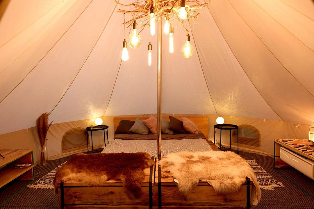 VIP-палатка с двуспальной кроватью, кондиционером, обогревателем и всем необходимым.