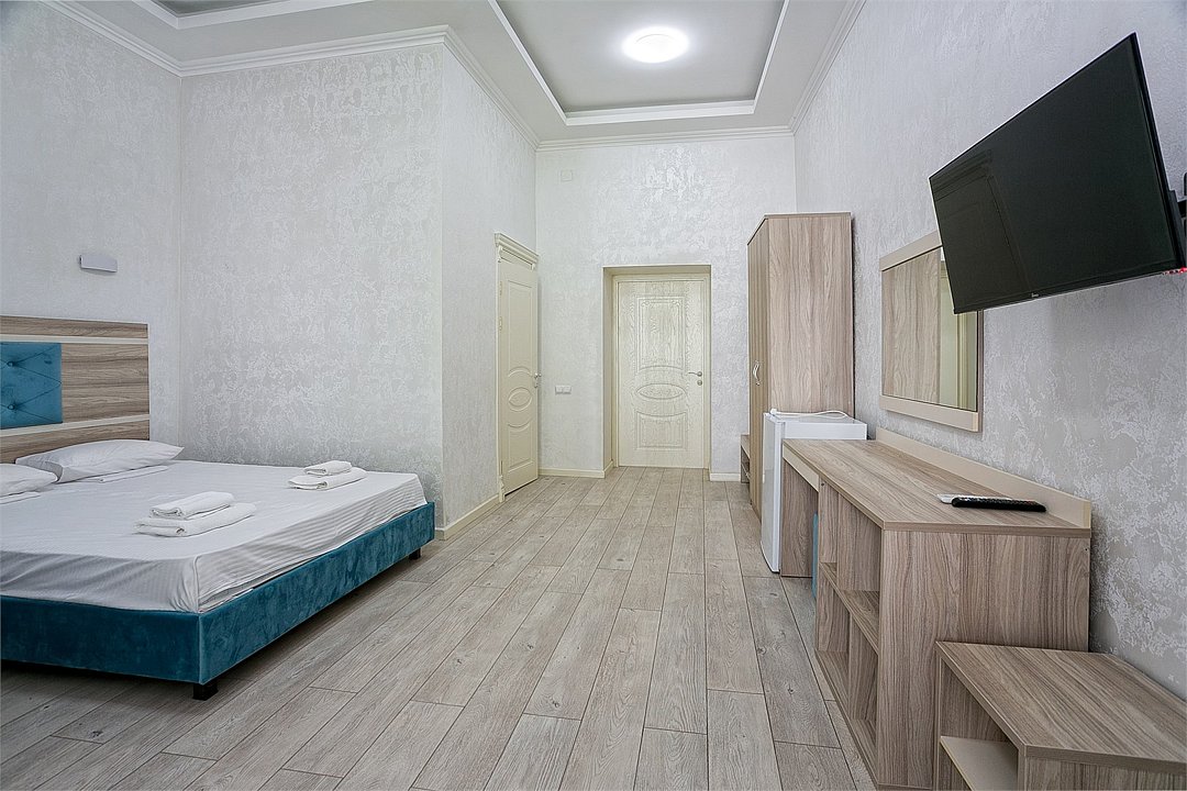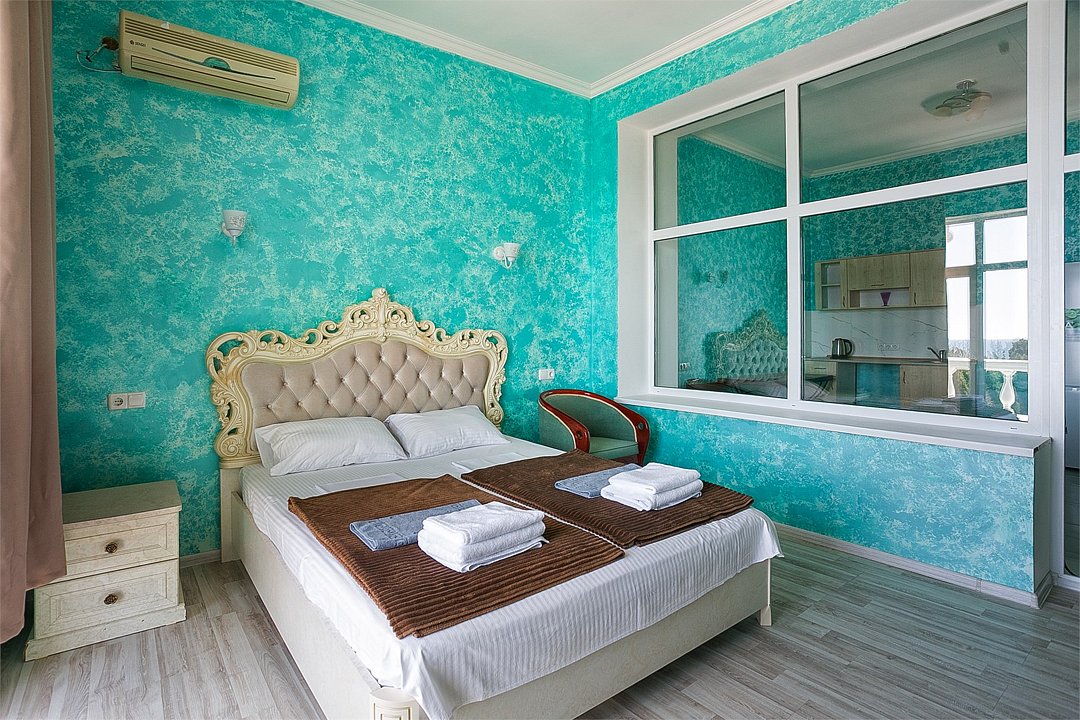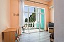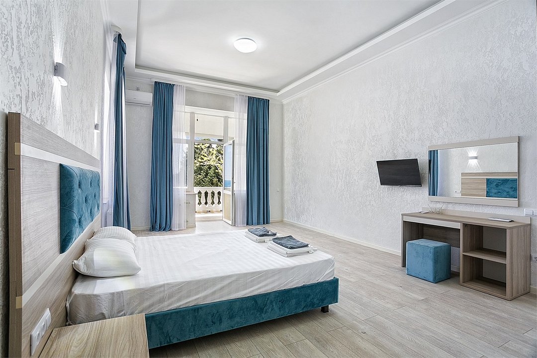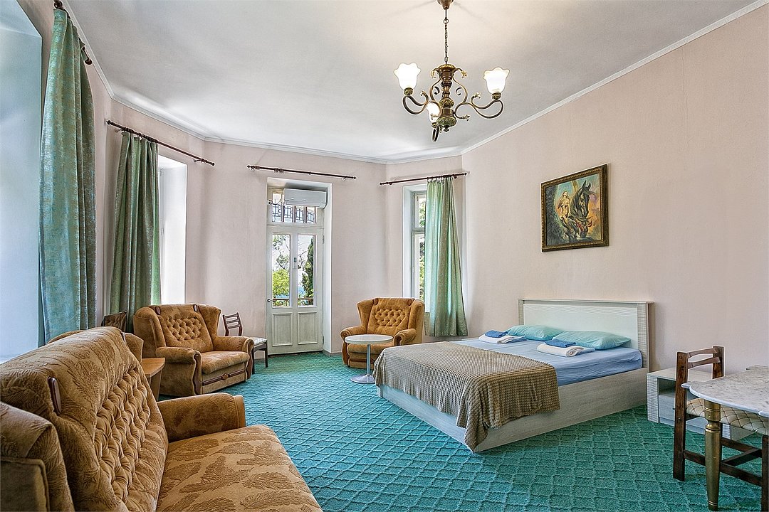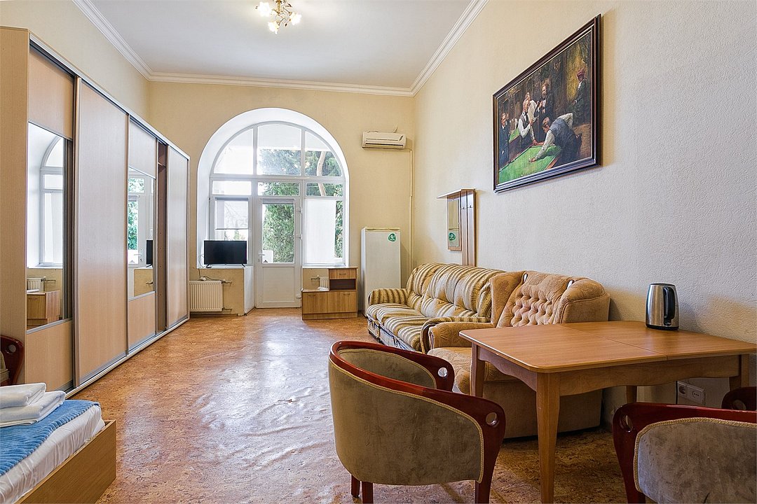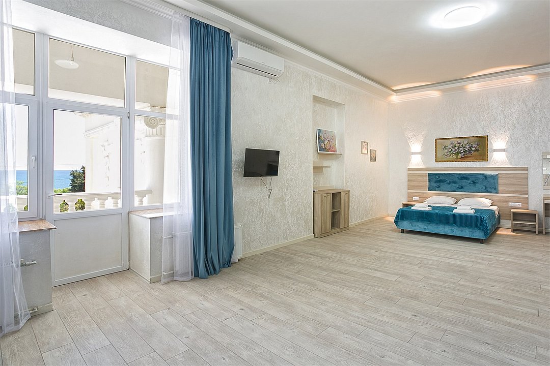 Большой однокомнатный уютный номер с одной двуспальной кроватью, расположенный в корпусе "Ампир", с балконом и видом на море. Санузел с душевой кабиной. Есть кухонный уголок с холодильником, электроплитой, электрочайником, мойкой и кухонным гарнитуром. По запросу может быть предоставлена еврораскладушка. Возможно размещение одного или двух детей до 4-х лет без предоставления дополнительного места.Услуги и удобства