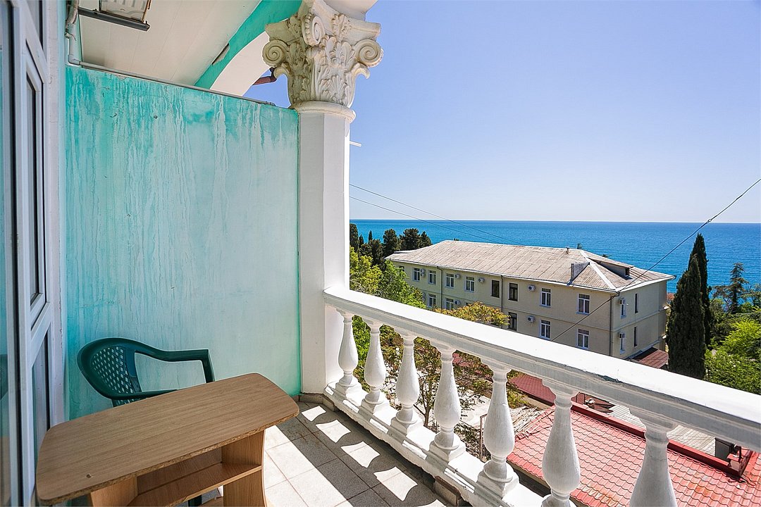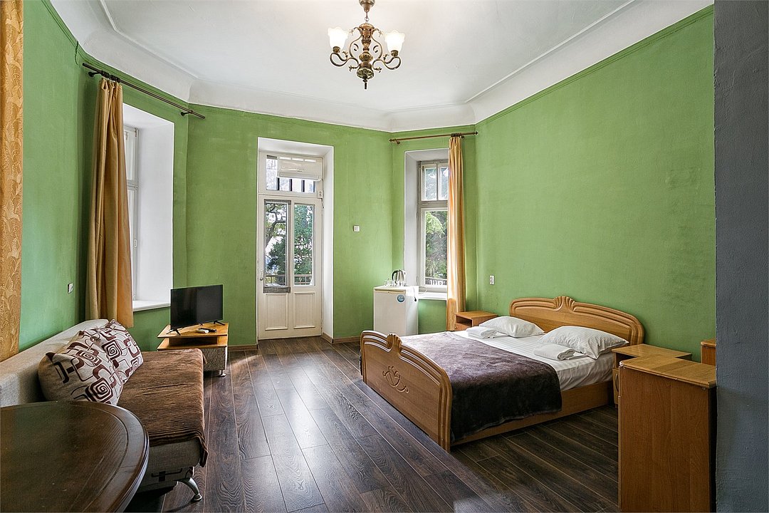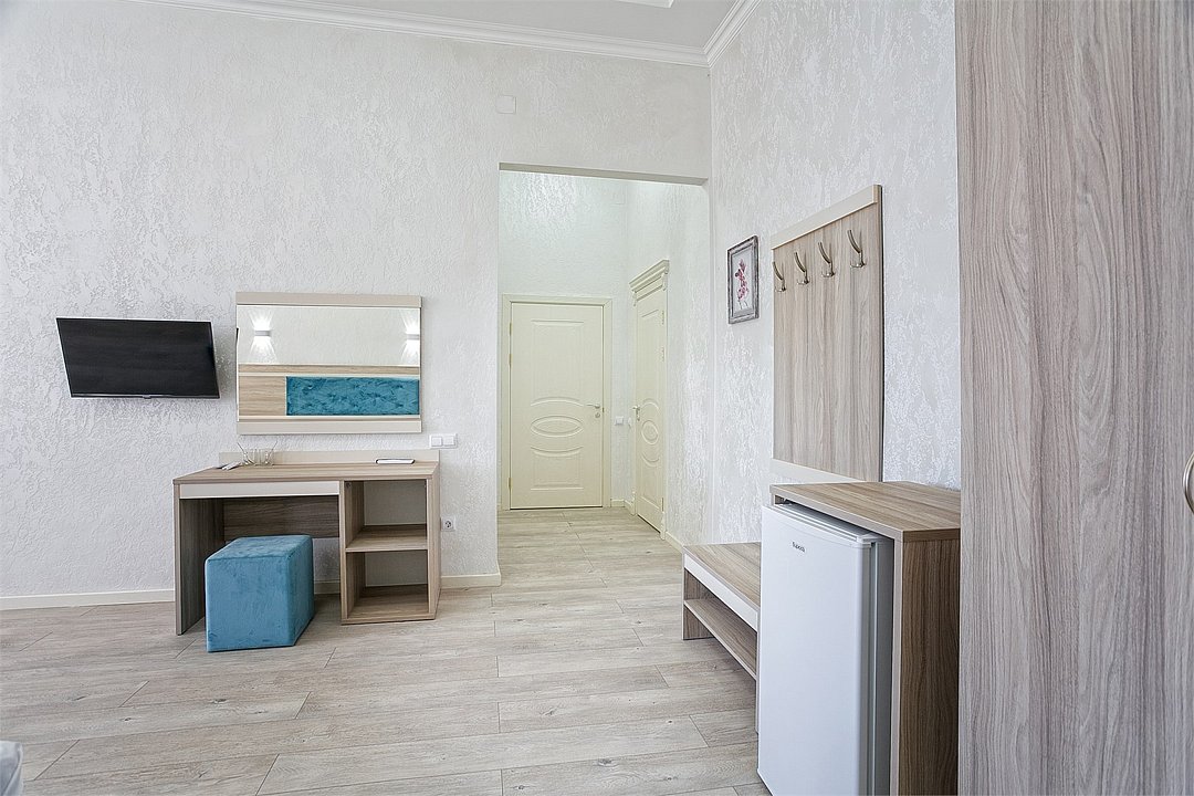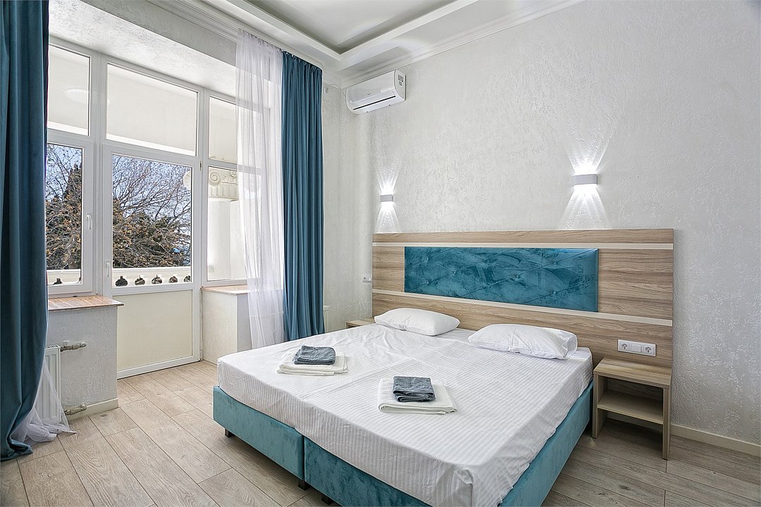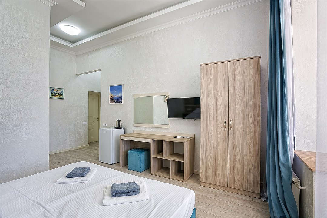 Большой однокомнатный уютный номер с одной двуспальной кроватью, расположенный в корпусе "Ампир", с балконом и видом на море. Санузел с душевой кабиной. Есть кухонный уголок с холодильником, электроплитой, электрочайником, мойкой и кухонным гарнитуром. По запросу может быть предоставлена еврораскладушка. Возможно размещение одного или двух детей до 4-х лет без предоставления дополнительного места.Услуги и удобства