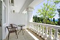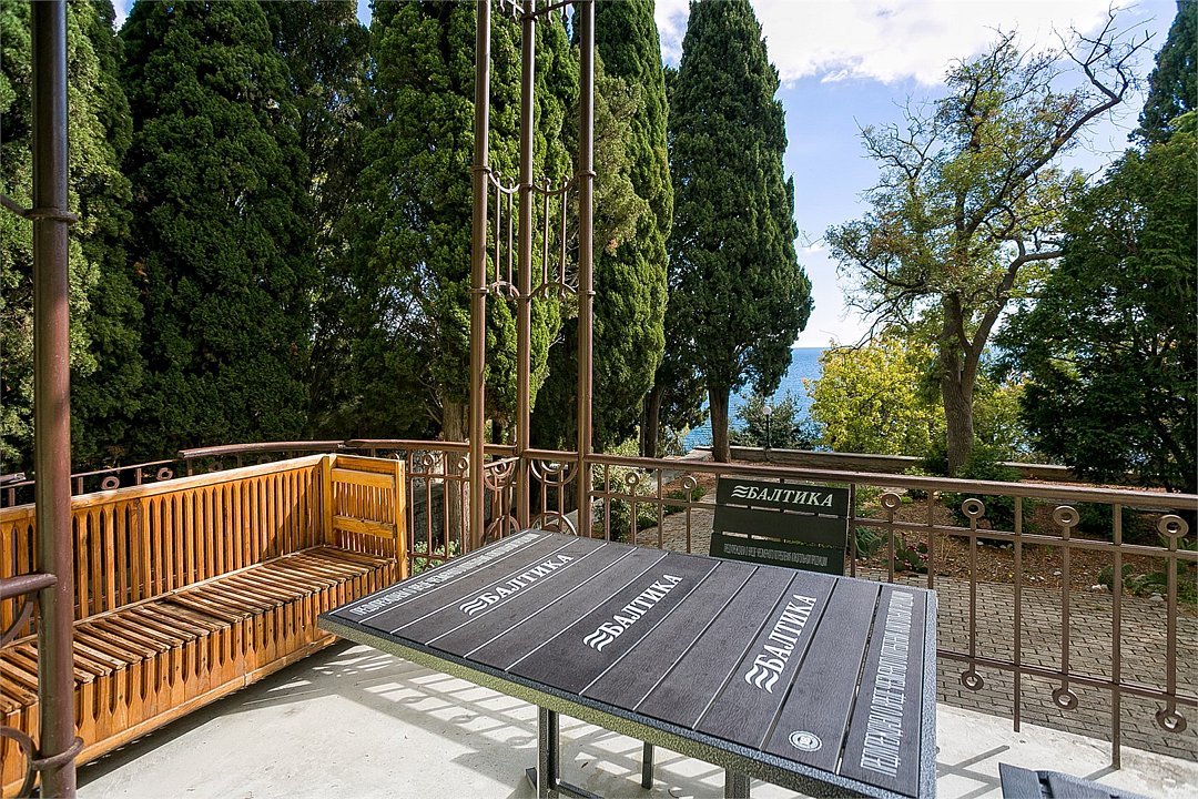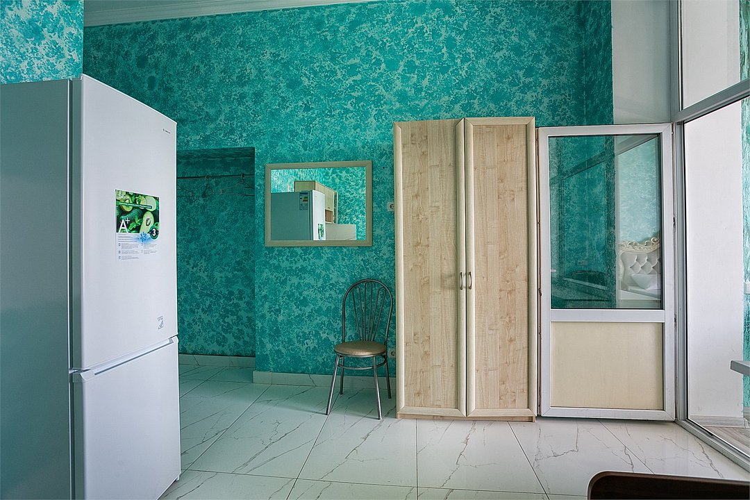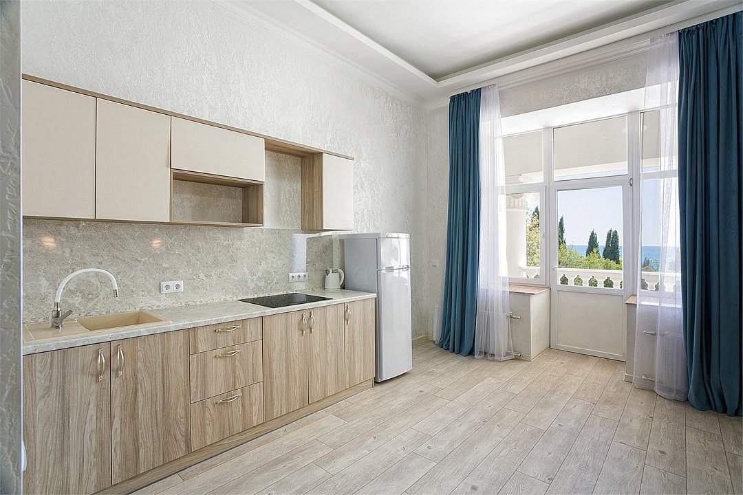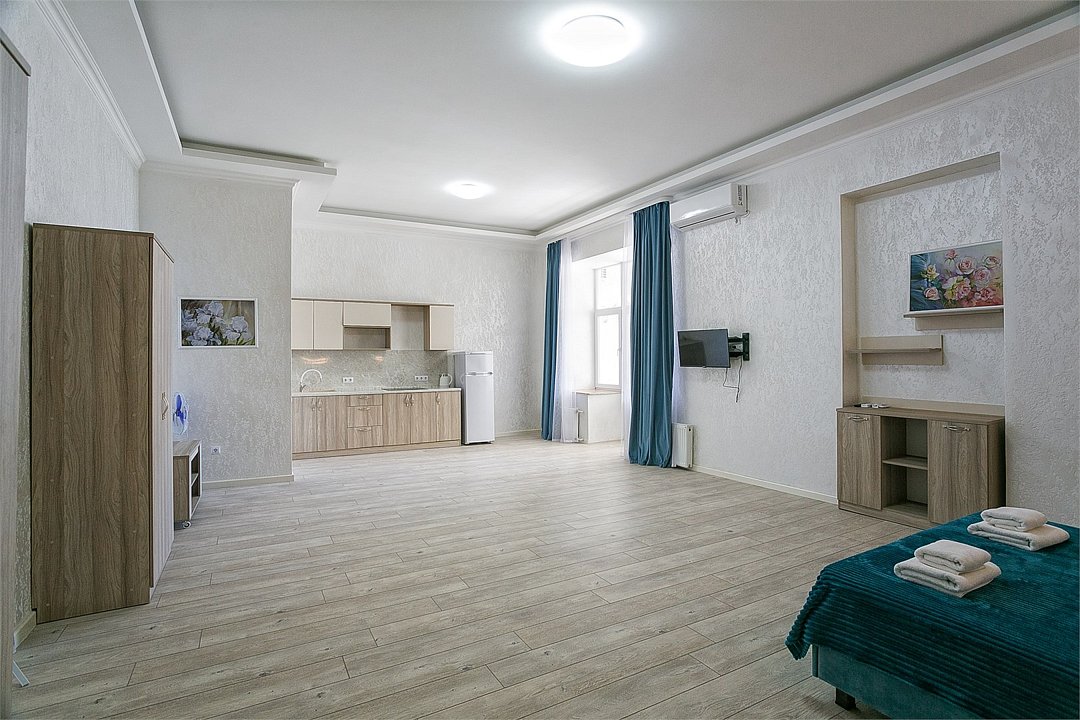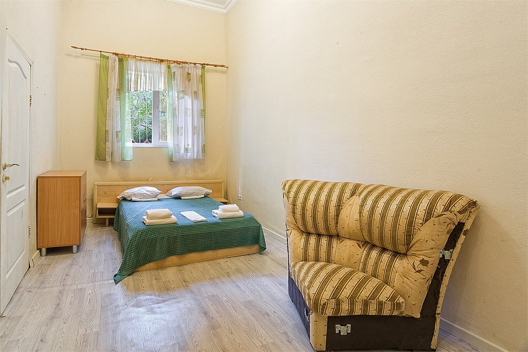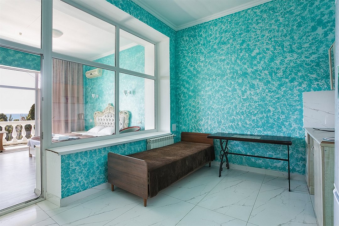 Большой однокомнатный уютный номер с одной двуспальной кроватью, расположенный в корпусе "Ампир", с балконом и видом на море. Санузел с душевой кабиной. Есть кухонный уголок с холодильником, электроплитой, электрочайником, мойкой и кухонным гарнитуром. По запросу может быть предоставлена еврораскладушка. Возможно размещение одного или двух детей до 4-х лет без предоставления дополнительного места.Услуги и удобства