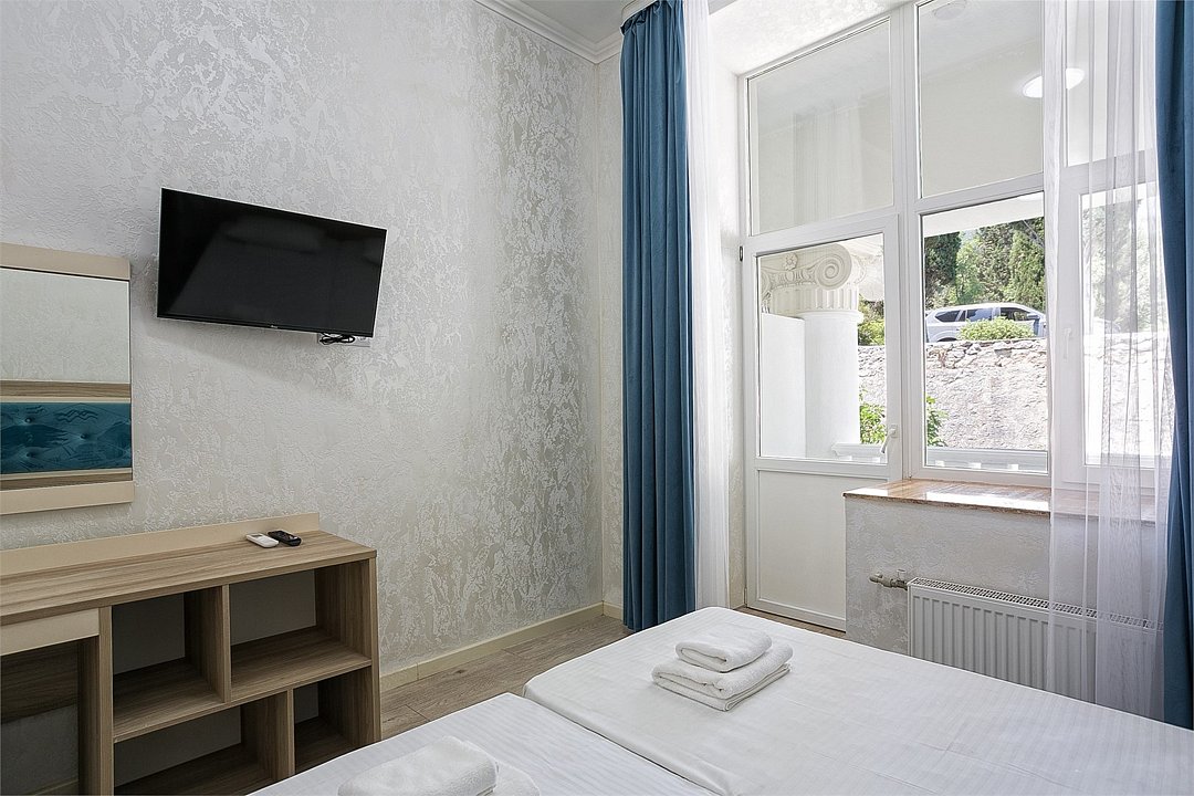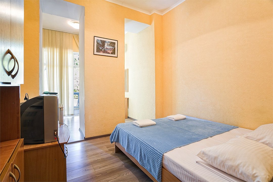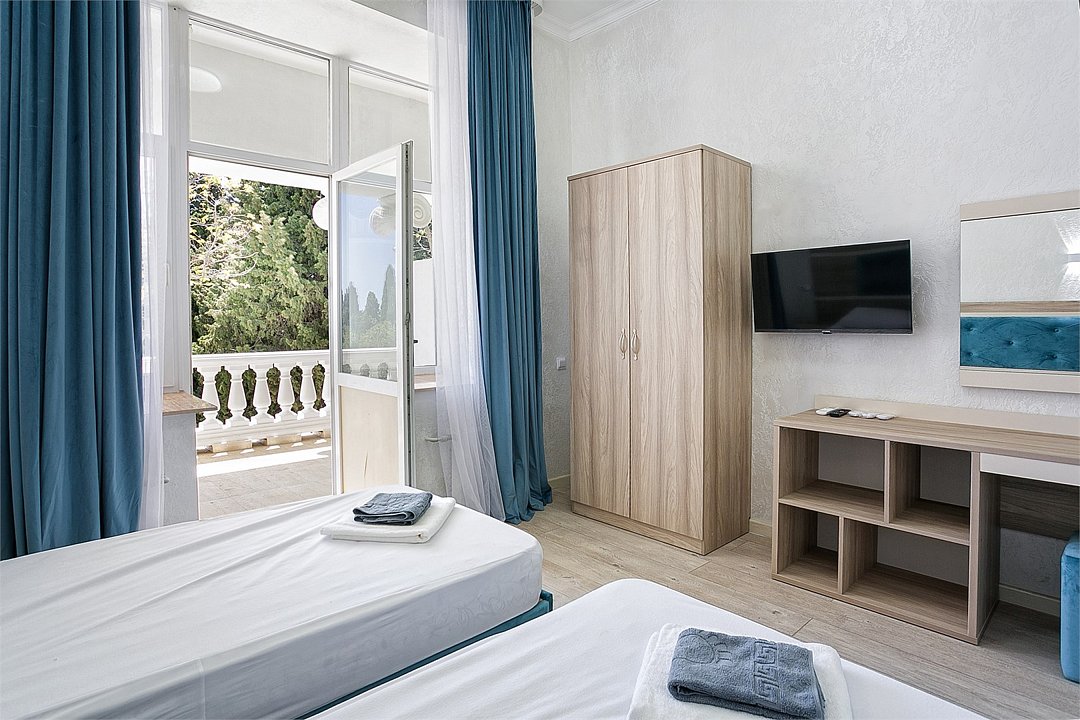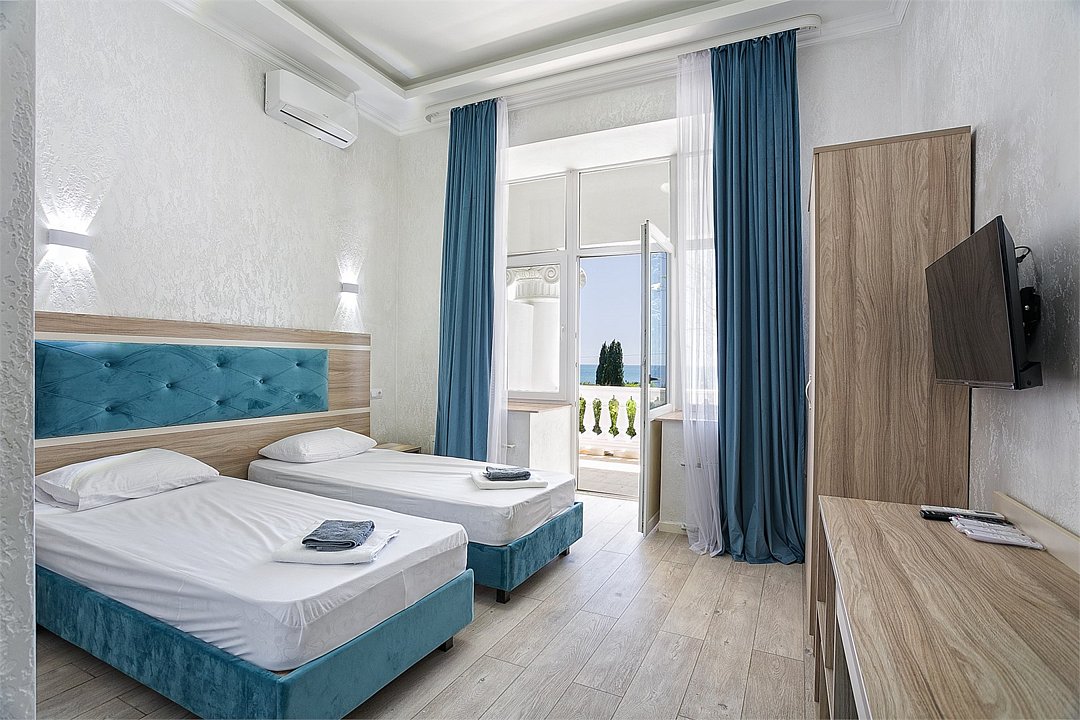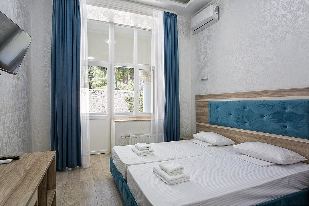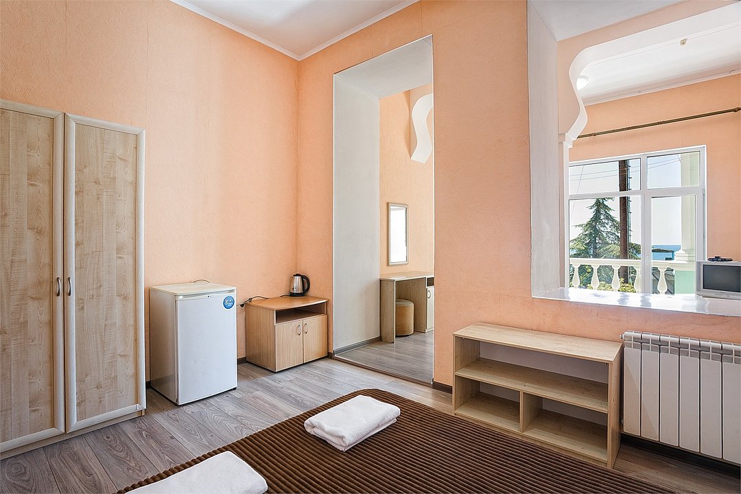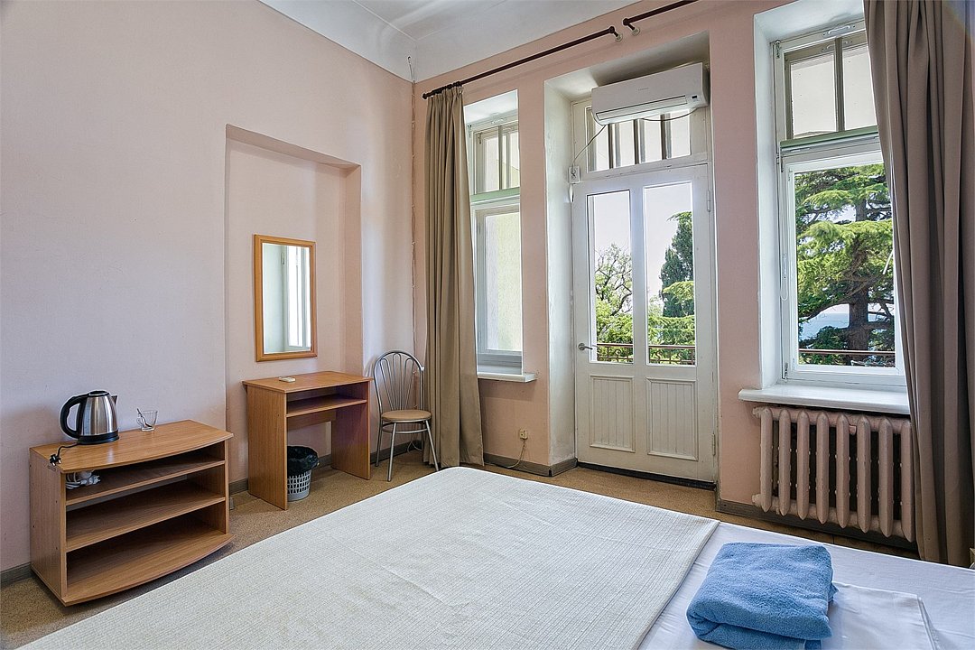 Однокомнатный уютный номер с одной двуспальной кроватью и одной односпальной кроватью, расположенный в корпусе "Ампир", с балконом и видом на море. Санузел с душевой кабиной. Возможно размещение одного или двух детей до 4-х лет без предоставления дополнительного места.Услуги и удобства