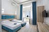 Двухкомнатный просторный и уютный номер, расположенный в корпусе "Дельфин" на втором этаже с большим балконом, с видом на море. Есть небольшой кухонный уголок с мойкой и электроплитой (предоставляется по требованию). Санузел - душевая. Основные места - 1 двуспальная кровать, дополнительное место - 1 односпальная кровать.Услуги и удобства
