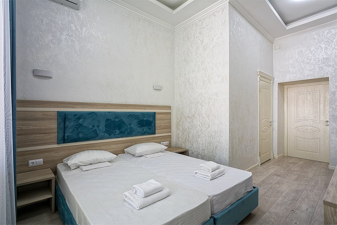 Двухкомнатный номер, расположенный в корпусе "Дельфин" на первом этаже с балконом, с видом на море. Санузел - душевая. Основные места - 1 двуспальная кровать, дополнительное место - 2 односпальные кровати.Услуги и удобства