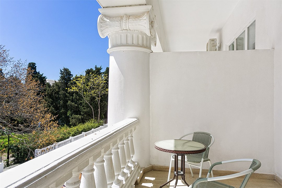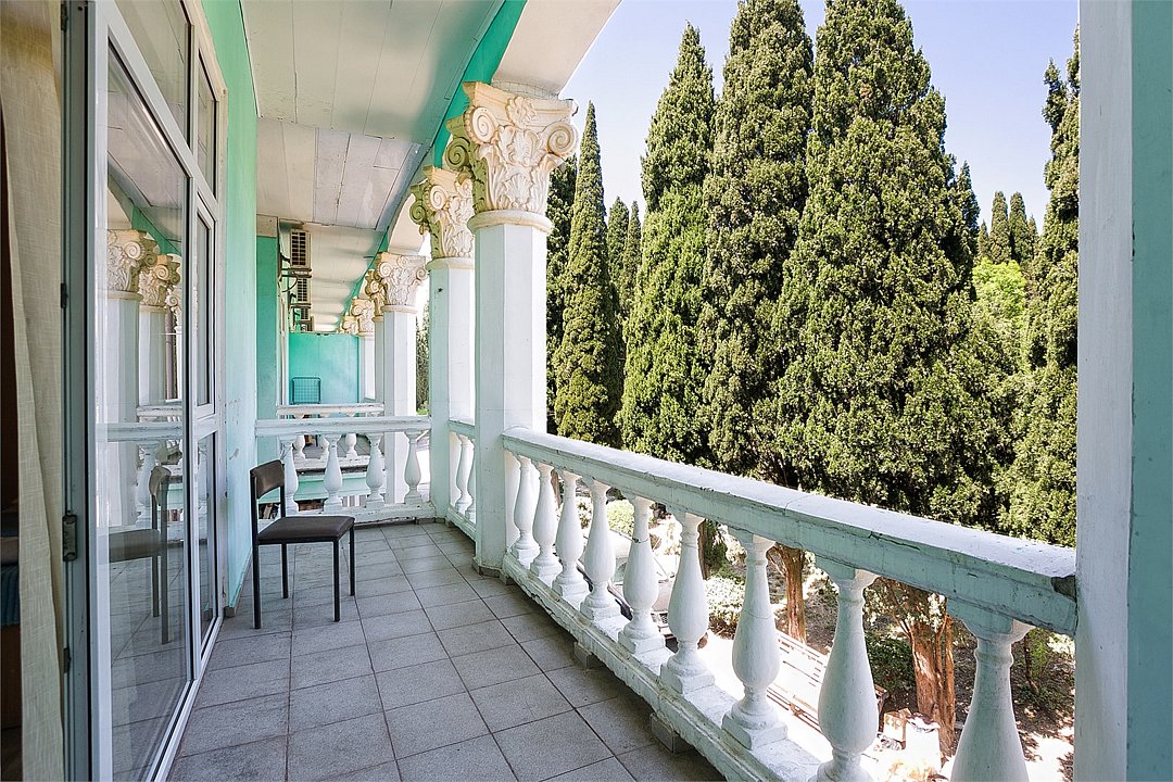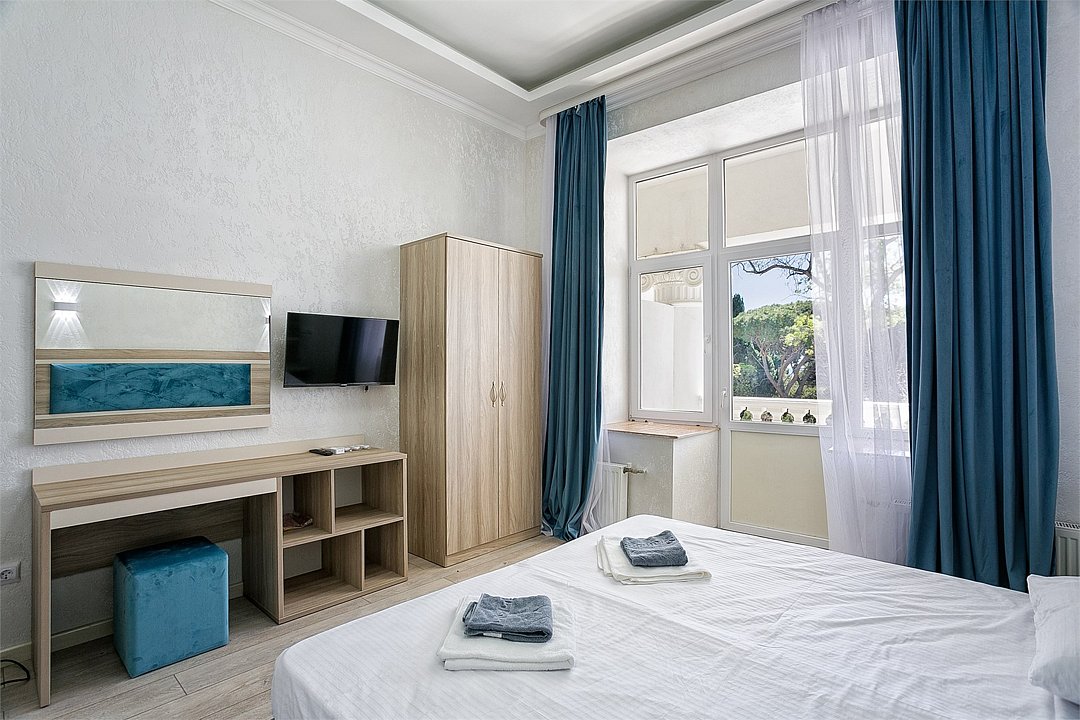 Однокомнатный просторный номер с одной двуспальной кроватью, расположенный в корпусе "Ампир", с балконом, с частичным видом на море и парк. Санузел с душевой кабиной. Возможно размещение одного или двух детей до 4-х лет без предоставления дополнительного места.Услуги и удобства
