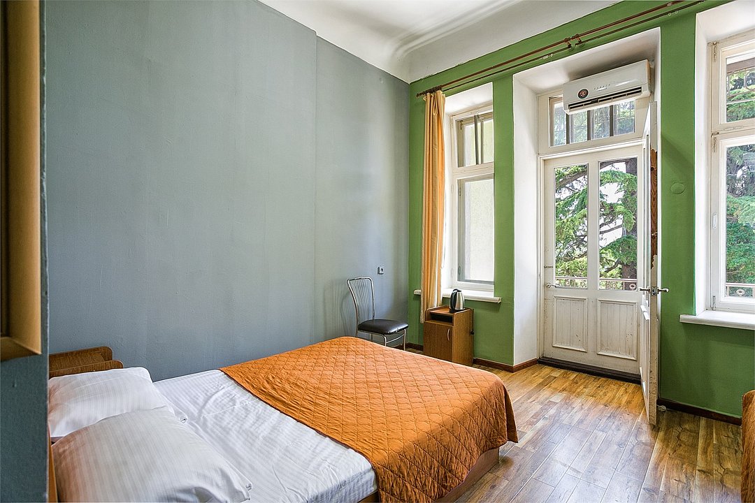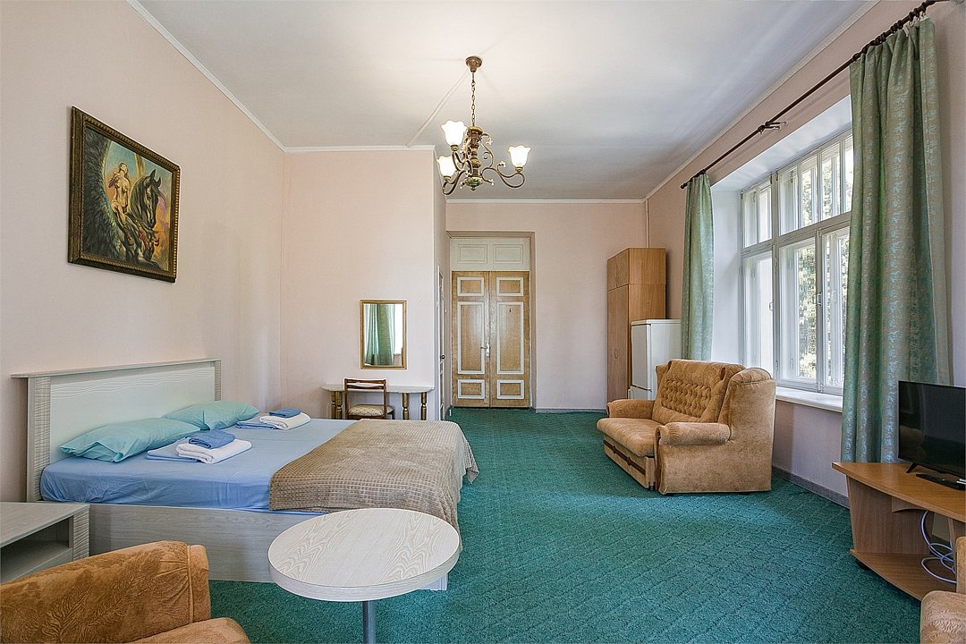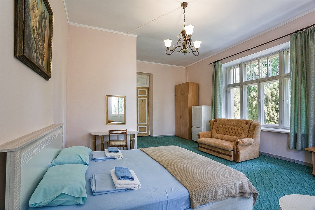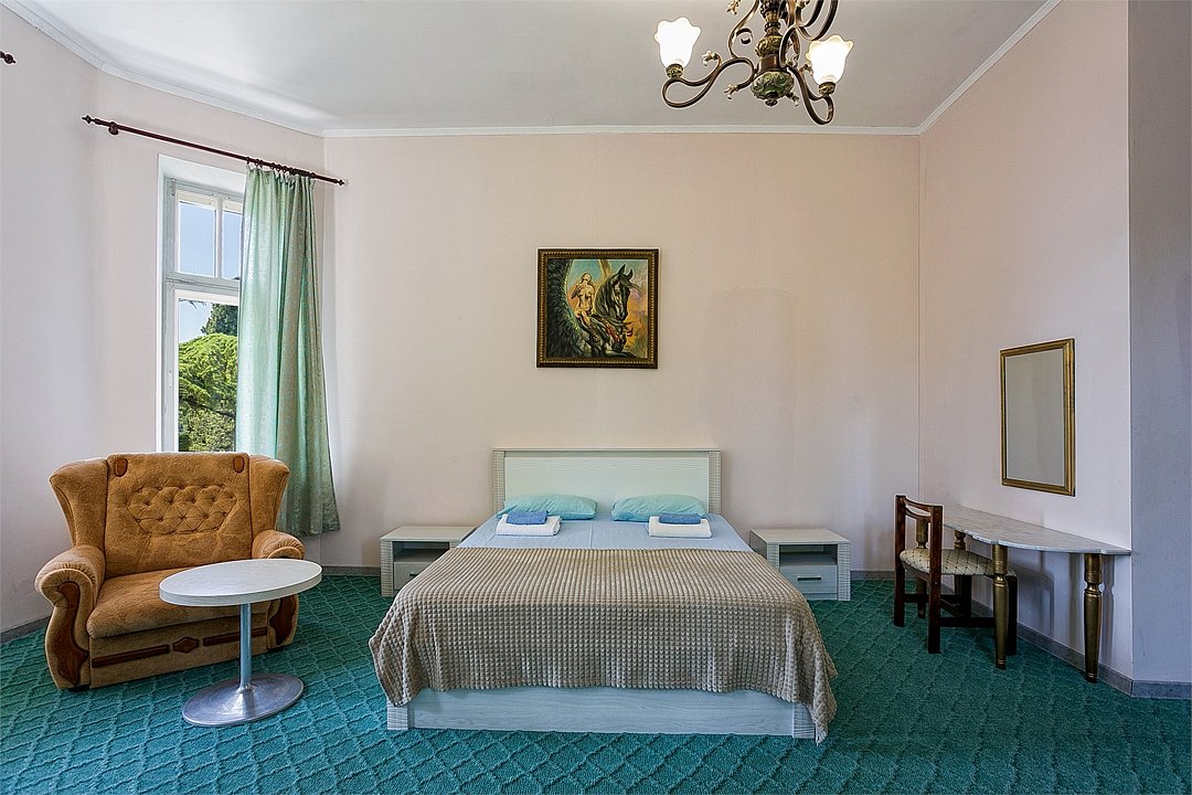 Однокомнатный уютный и просторный номер с одной двуспальной (совмещённая) или двумя односпальными кроватями, расположенный в корпусе "Ампир", с балконом и видом на парк и горы. Санузел с душевой кабиной. Возможно размещение одного или двух детей до 4-х лет без предоставления дополнительного места.Услуги и удобства