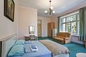 Просторный двухкомнатный номер с двумя двуспальными кроватями и одним односпальным раскладным диваном, расположенный в корпусе "Ампир" на первом этаже, с балконом и видом на парк. Санузел с душевой кабиной.Услуги и удобства