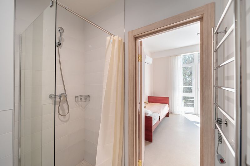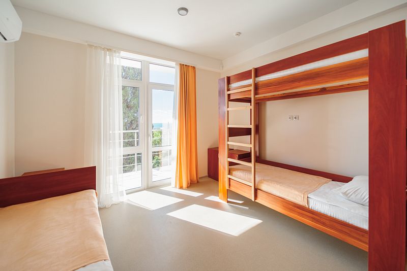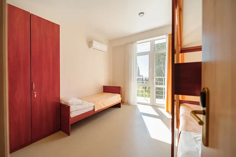 Трехместный/четырехместный номер (по доступности) с отдельной ванной комнатой. Из номеров открывается завораживающий вид на море, либо на парковую зону. Номера оснащены двухъярусными и односпальными кроватями.