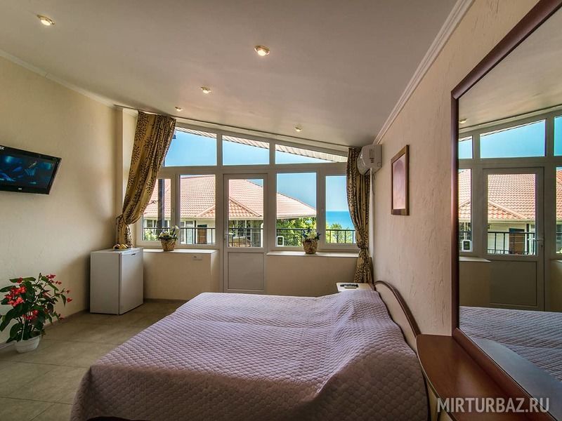 В номере двух спальная кровать диван сан узел холодильник, тв, терраса с видом на море.