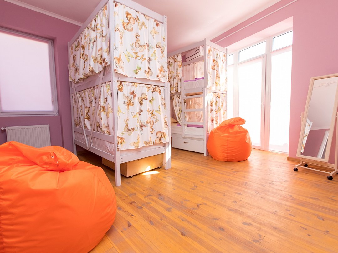 Номер для женщин “Лавандовый”. с собственным санузлом. Номер расположен на втором этаже двухэтажного здания гостиницы “Фортуна”. В комнате преобладают цветочные оттенки крымской лаванды в тонах окраски стен и постельных принадлежностей. Вся отделка номера из натуральных материалов, общей площадью 30 кв. метров. В номере есть балкон, кондиционер. Для гостей номера предусмотрены шкафчики под ключ, вешалка для вещей, зеркало во весь рост и двухъярусные кровати из натурального дерева со шторками для индивидуального пространства гостей, светильники, WiFi, смарт ТВ. Оригинальный сан узел с душевой кабиной украшает номер.В номере