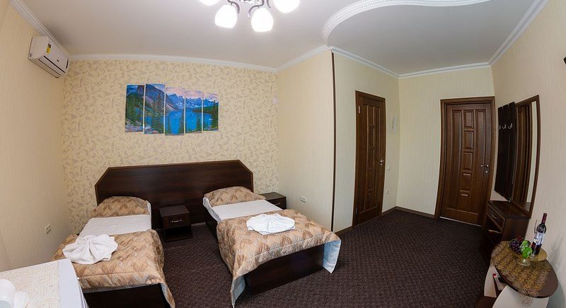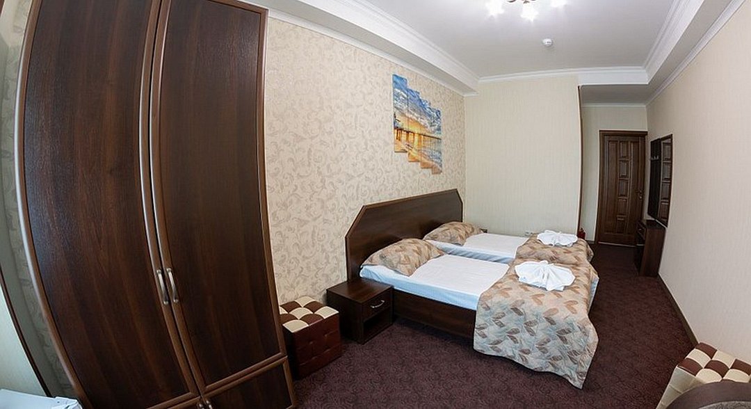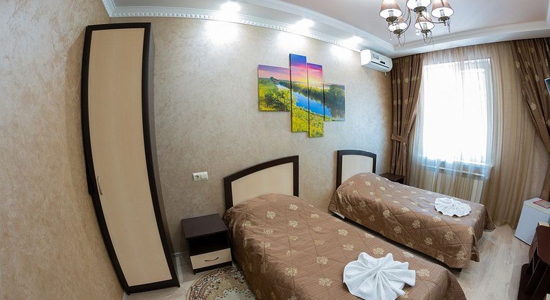Две односпальные кровати, шкаф, прикроватные тумбочки, гардероб, вешалка, пуфик, кондиционер, зеркало, тумбочка, журнальный столик, набор полотенец, набор постельного белья, щетка для одежды/обуви, телевизор, Wi-Fi. В ванной: туалет, раковина, душевая кабина, средства личной гигиены, фен, зеркало, набор полотенец.Услуги и удобства