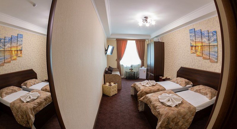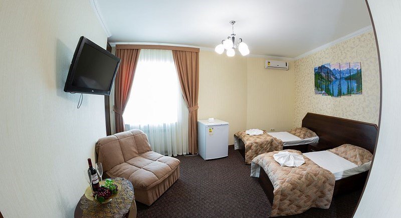 Две односпальные кровати, шкаф, диван-кровать, прикроватные тумбочки, вешалка, пуфик, кондиционер, зеркало, набор полотенец, набор постельного белья, щетка для одежды/обуви, телевизор, Wi-Fi, холодильник. В ванной: туалет, раковина, душевая кабина, средства личной гигиены, фен, зеркало, набор полотенец.Услуги и удобства