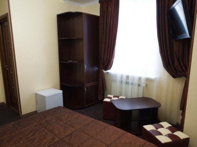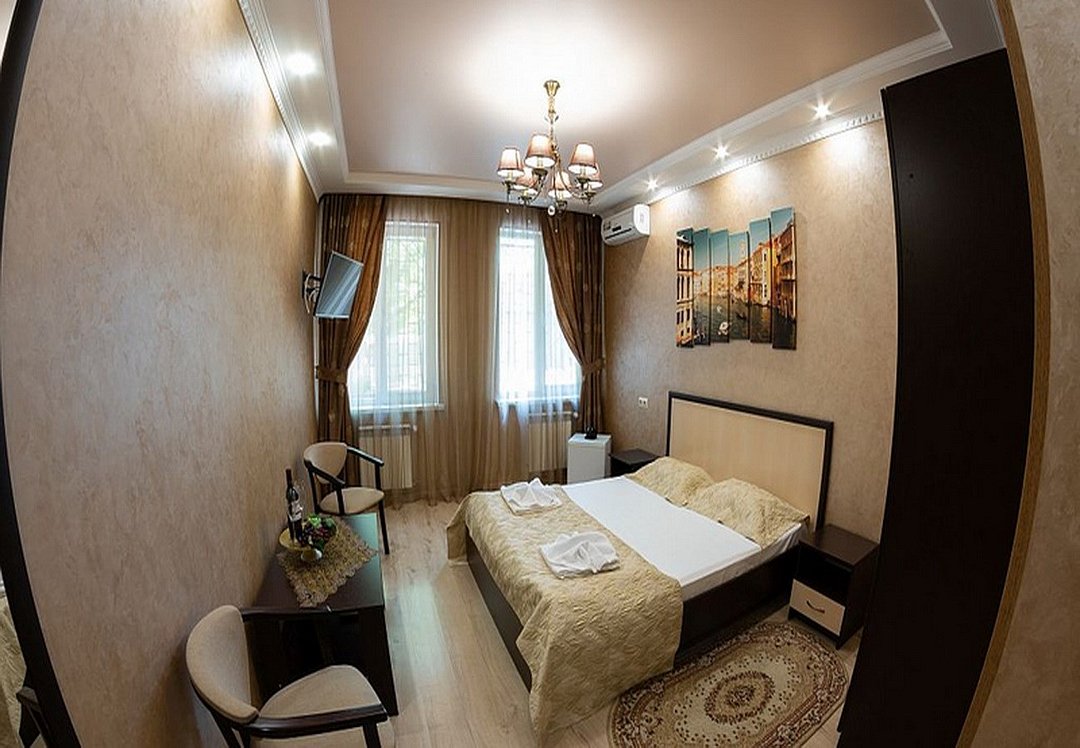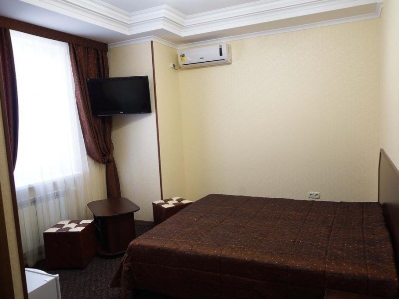 В комнате: двуспальная кровать, стол, шкаф, прикроватные тумбочки, вешалка, пуфик, кондиционер, зеркало, телевизор. В ванной: туалет, раковина, душ, душевая кабина, средства личной гигиены, фен, зеркало, набор полотенец. В номере нет окна.Услуги и удобства