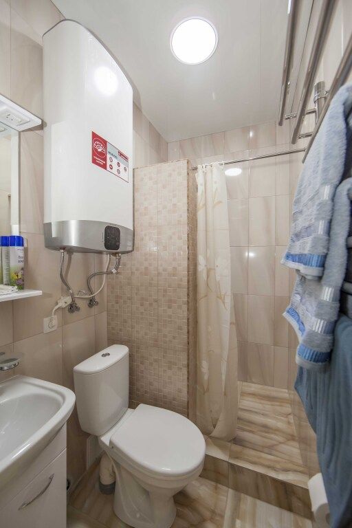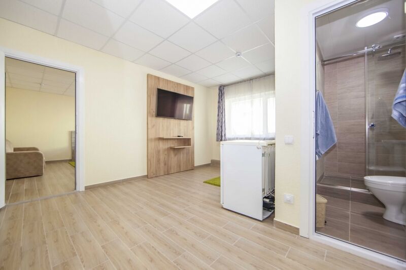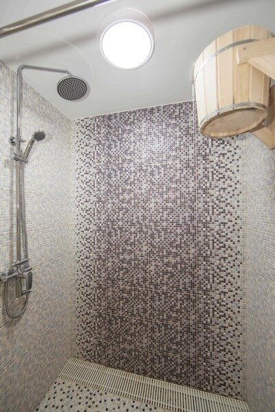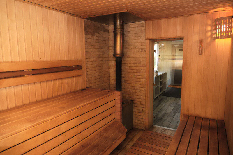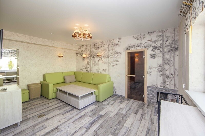 Русская баня на дровах. Комната для отдыха с удобным диваном, пуфиками, столом и телевизором. Санузел, душевая с обливным ведром, шапочки и рукавицы для веника. Есть фен для волос, простыни и тапочки. Кружки для пива и кваса. Кнопка вызова официанта: можно заказать чай и еду.