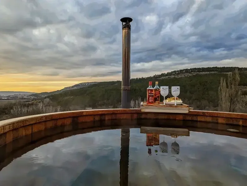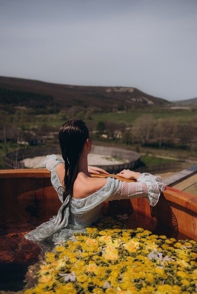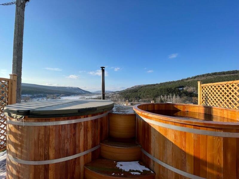 Деревянные чаны расположены под открытым небом у отеля с видом на Альминскую долину.