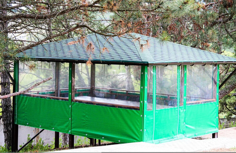 Беседки с мангальной зоной. Площадка освещена фонарями, внутри есть светильники и розетки.