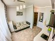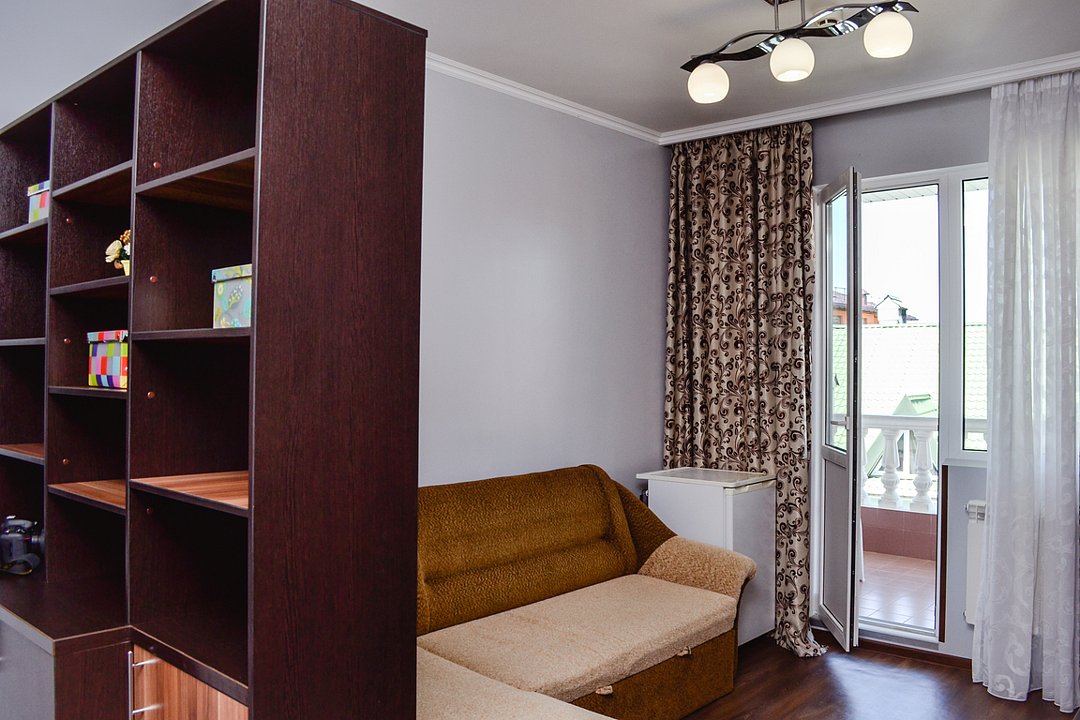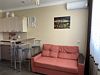 Одна двуспальная кровать, диван как основное место, шкафы для одежды, оборудованная кухня, обеденная зона, стиральная машина, с/у, душ, ТВ.