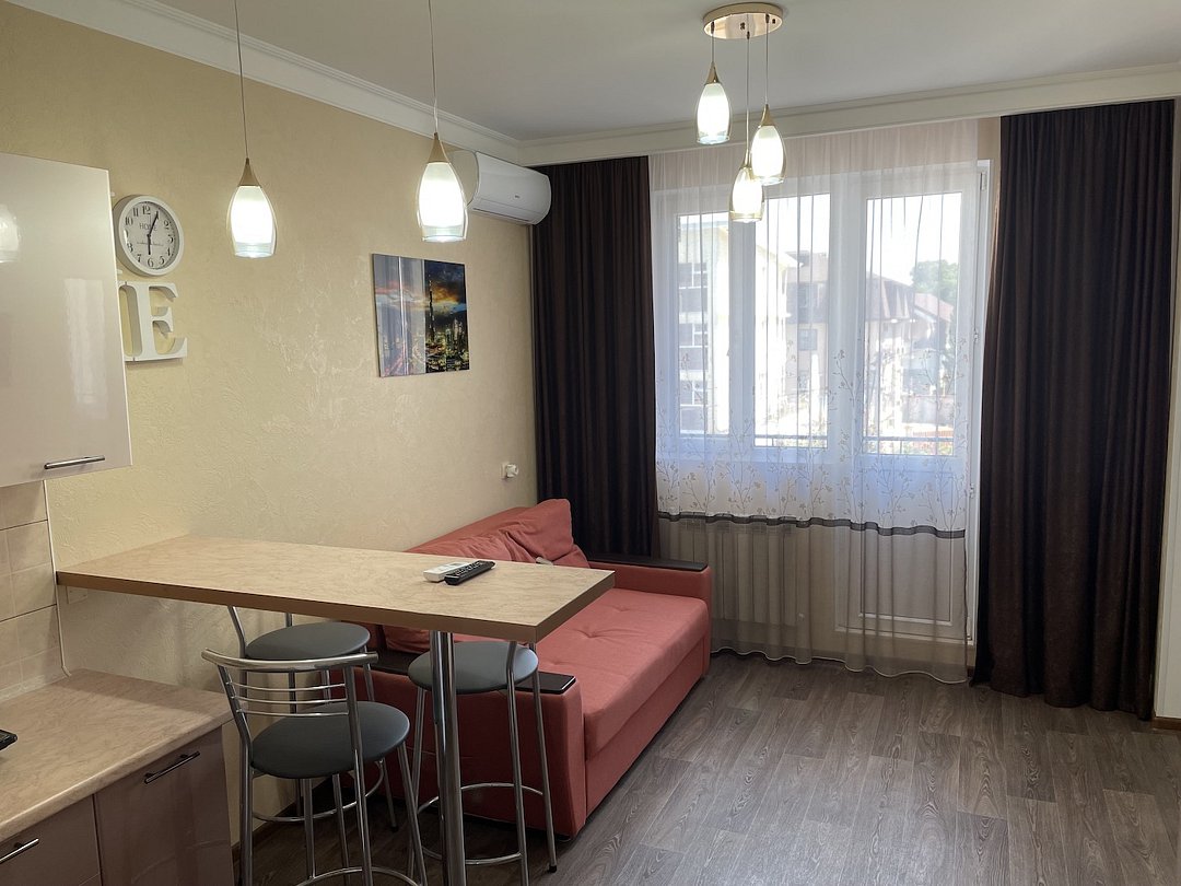 Одна двуспальная кровать, двуспальный диван как основное место, шкафы для одежды, оборудованная кухня, барная стойка, с/у, душ, ТВ.