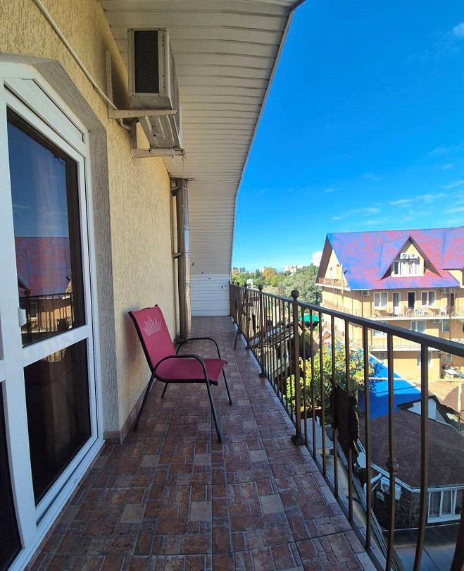 Номер улучшенной планировки с выходом на террасу, с собственным санузлом, кондиционером, холодильником, плазменным ТВ.Трехместный стандарт с балконом