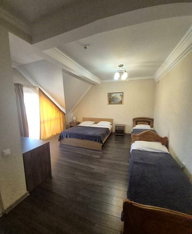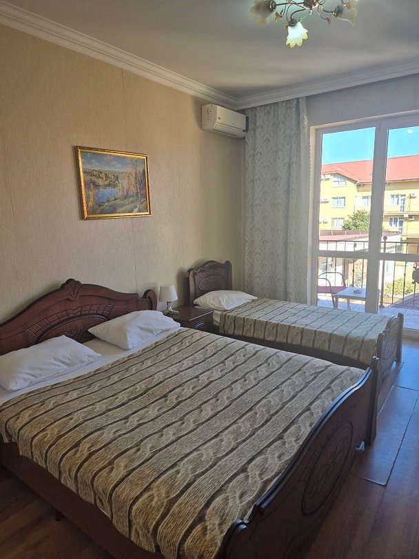 Номер выполнен в спокойных тонах, предназначен для размещения 4-х или 5-ти гостей максимум, с балконом. В номере двуспальная и две односпальные кровати. Для Вашего комфорта в ванной комнате предоставляются косметические принадлежности (гель для душа, шампунь, мыло).Услуги и удобства
