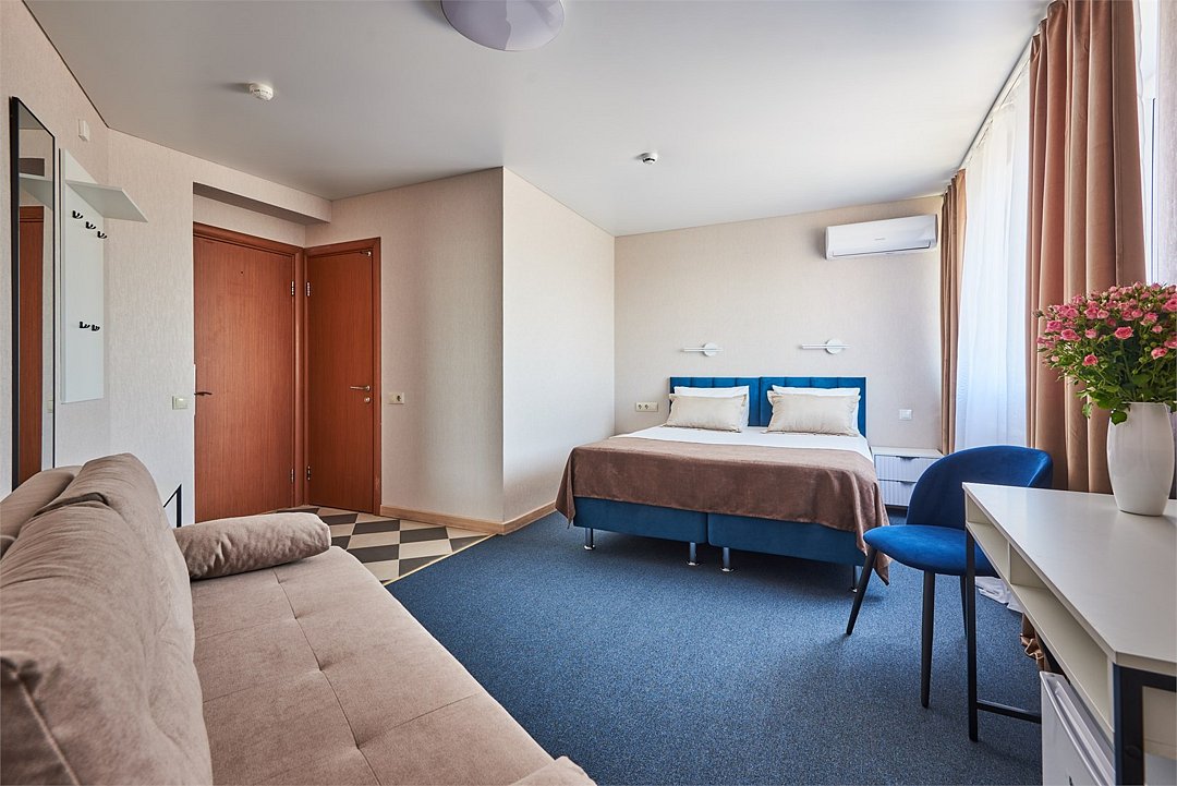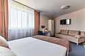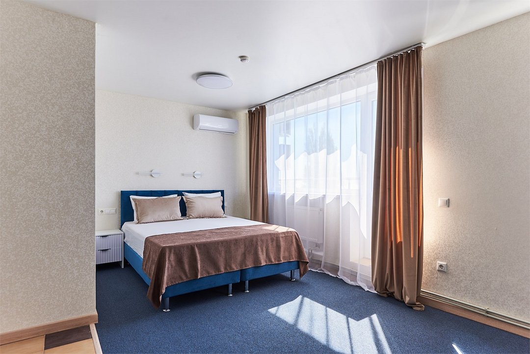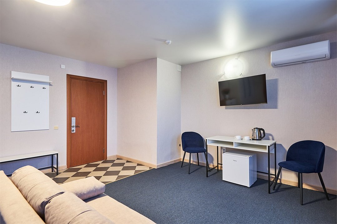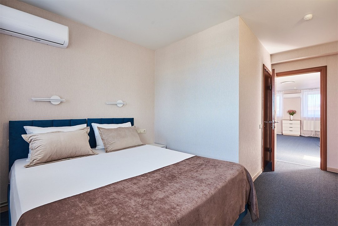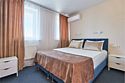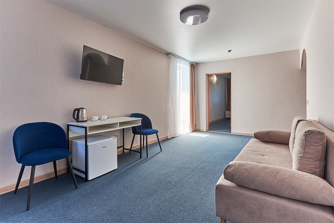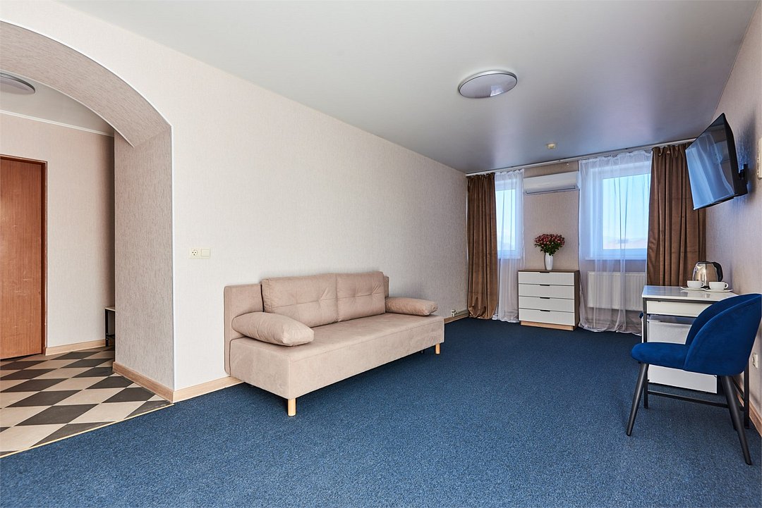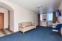 Номер люкс двухкомнатный - комфортный номер с двумя раздельными комнатами. В гостиной комнате расположен двуспальный диван, в спальной комнате - двуспальная кровать. Расположение номера на четвертом этаже. Напольное покрытие – ковролин. В номере имеется холодильник, телевизор, кондиционер сплит-система, фен, журнальный столик. В номере собственный санузел, в котором есть душ. Номера комплектуются набором полотенец на каждого гостя (банное, лицевое) и полотенце для ног. В ванной комнате есть косметические принадлежности: мыло, шампунь, гель для душа. В номере без предоставления дополнительного места и без дополнительной оплаты может проживать один ребенок в возрасте до 4 лет.Услуги и удобства