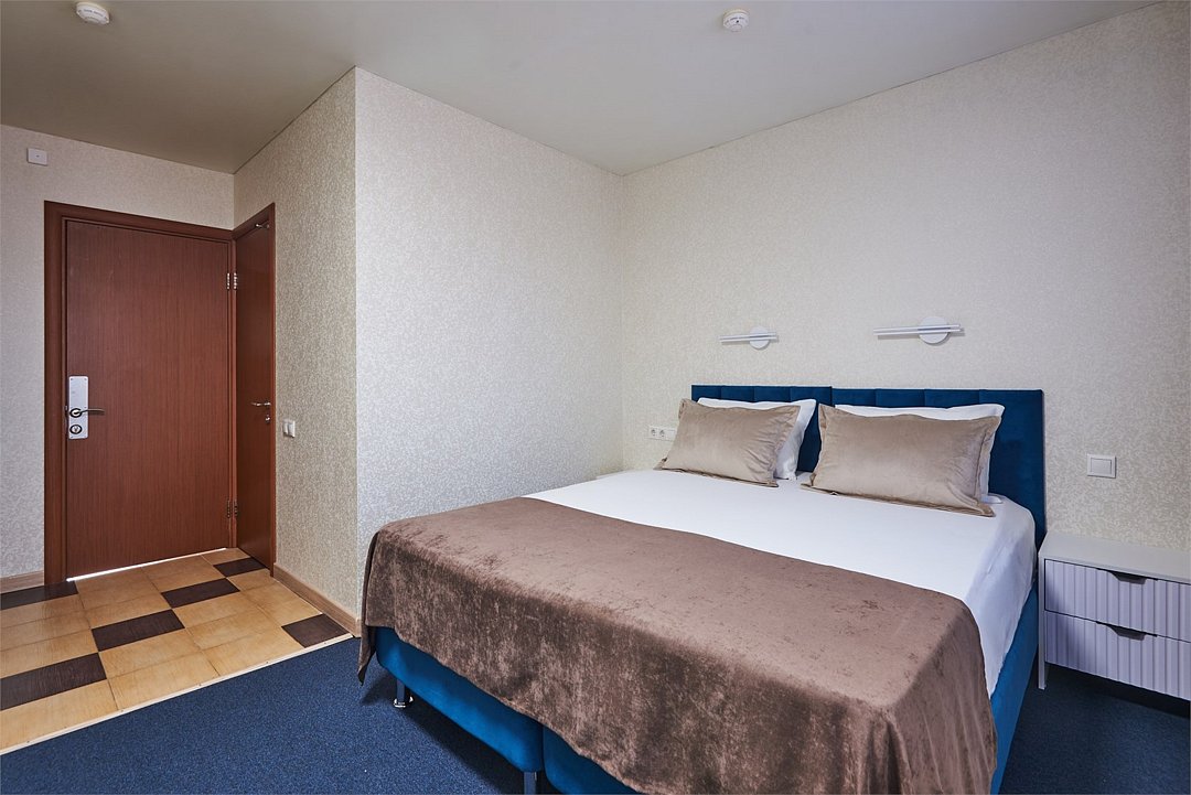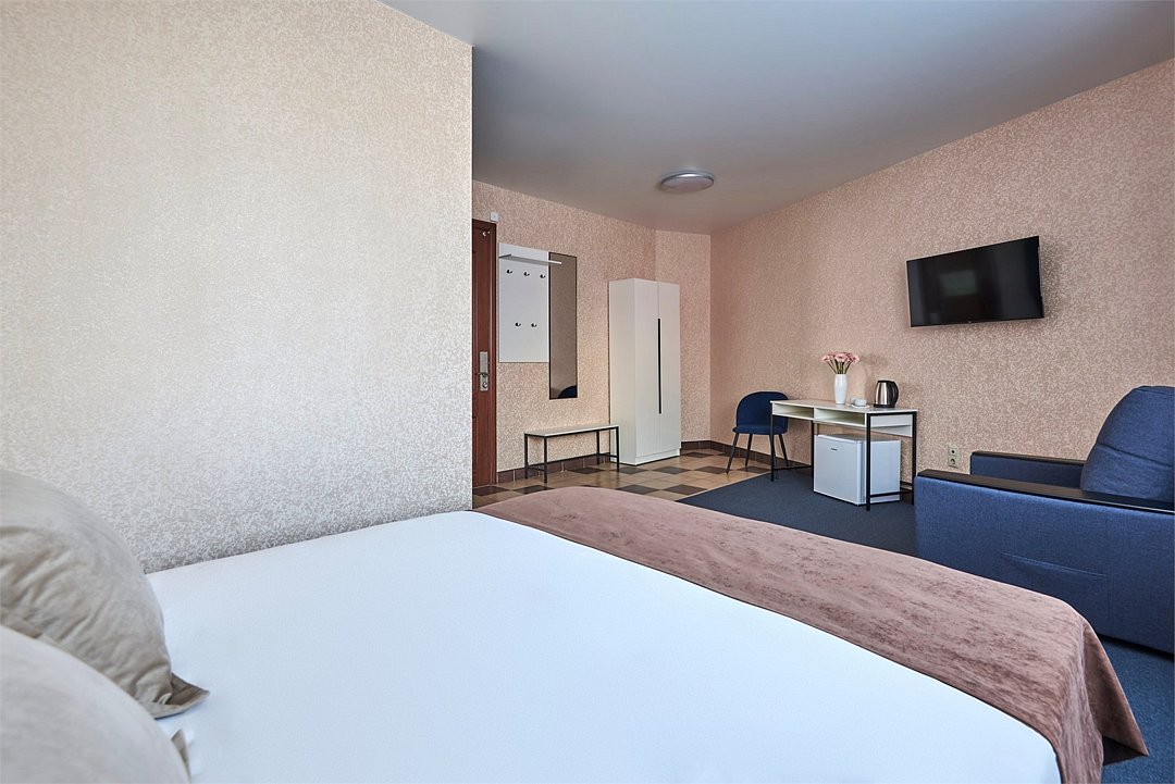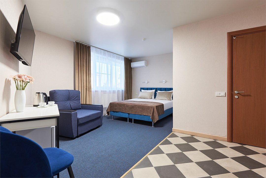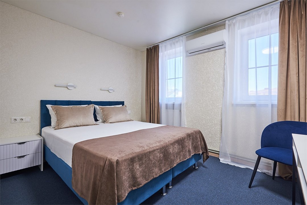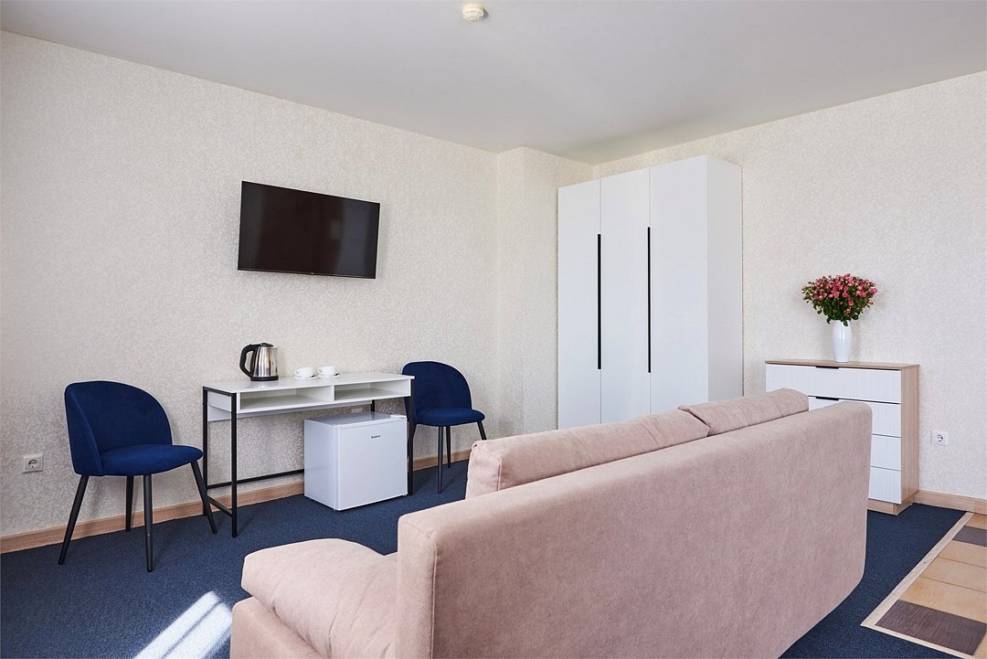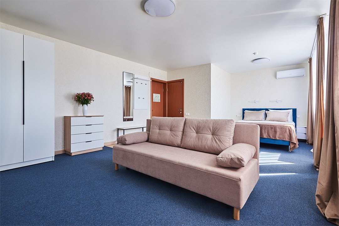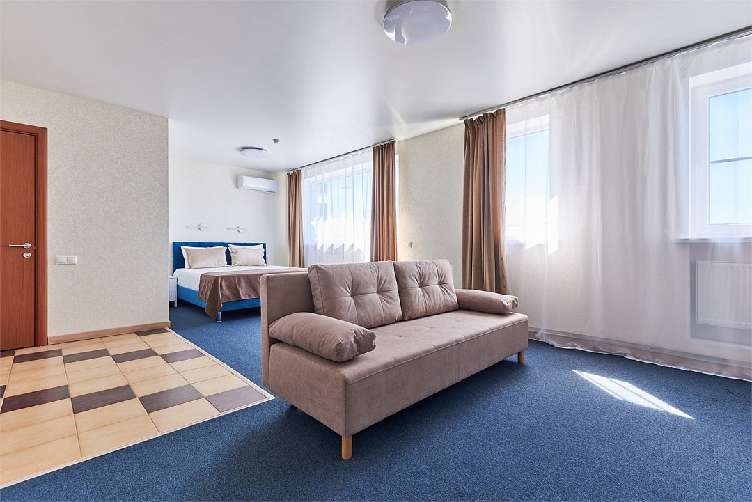 Номер люкс двухкомнатный - комфортный номер с двумя раздельными комнатами. В гостиной комнате расположен двуспальный диван, в спальной комнате - двуспальная кровать. Расположение номера на четвертом этаже. Напольное покрытие – ковролин. В номере имеется холодильник, телевизор, кондиционер сплит-система, фен, журнальный столик. В номере собственный санузел, в котором есть душ. Номера комплектуются набором полотенец на каждого гостя (банное, лицевое) и полотенце для ног. В ванной комнате есть косметические принадлежности: мыло, шампунь, гель для душа. В номере без предоставления дополнительного места и без дополнительной оплаты может проживать один ребенок в возрасте до 4 лет.Услуги и удобства