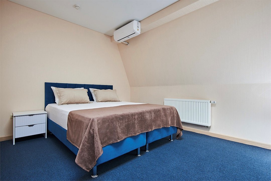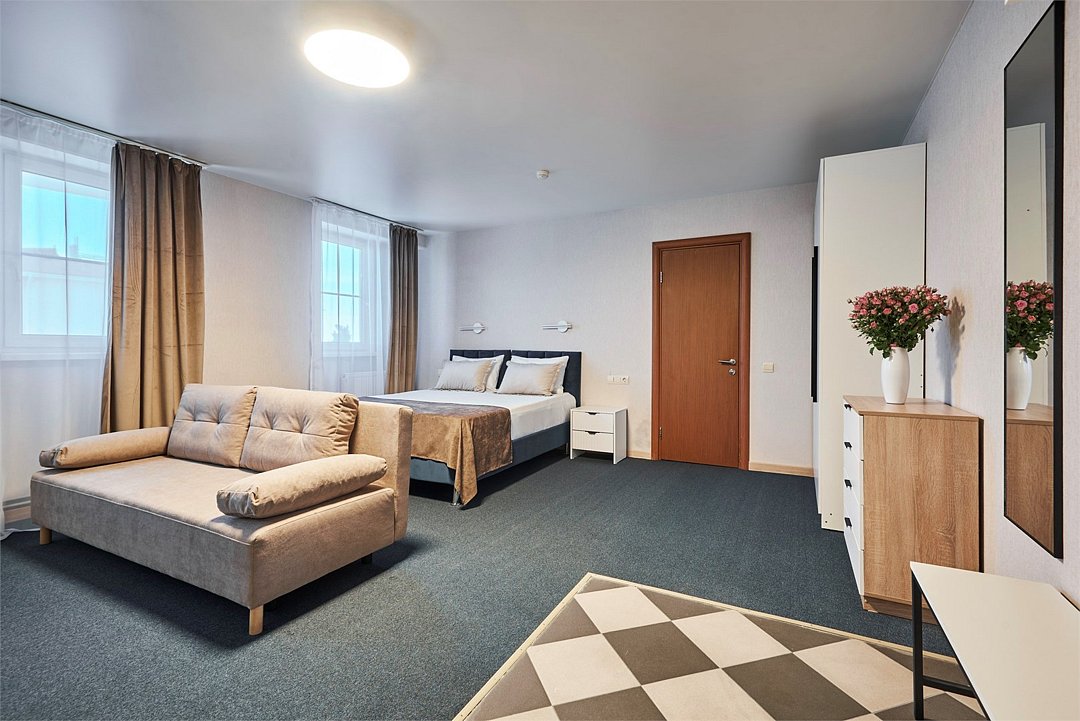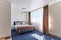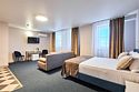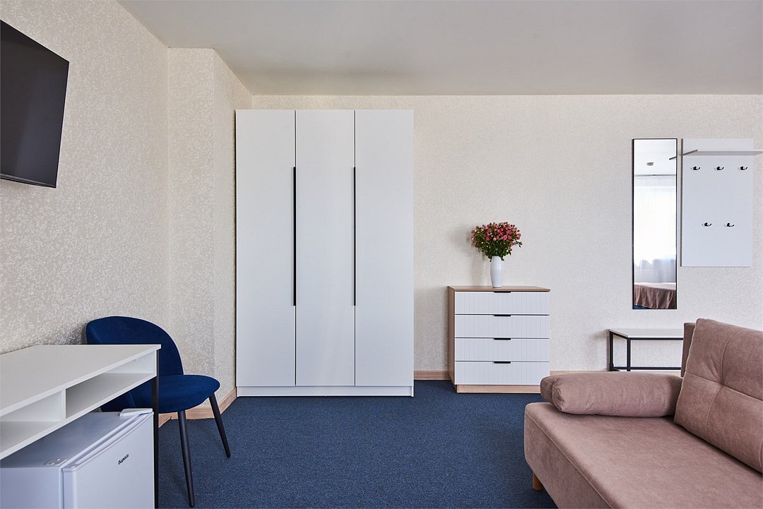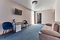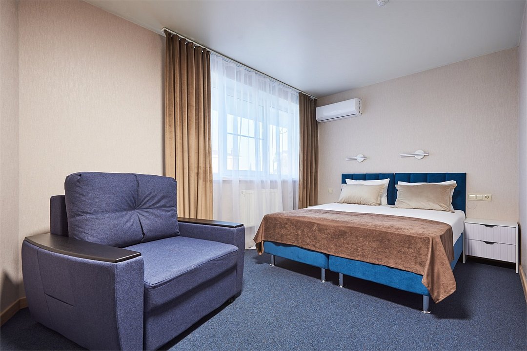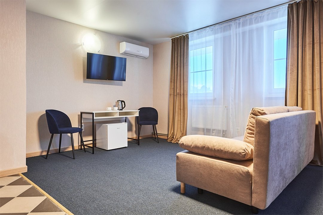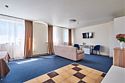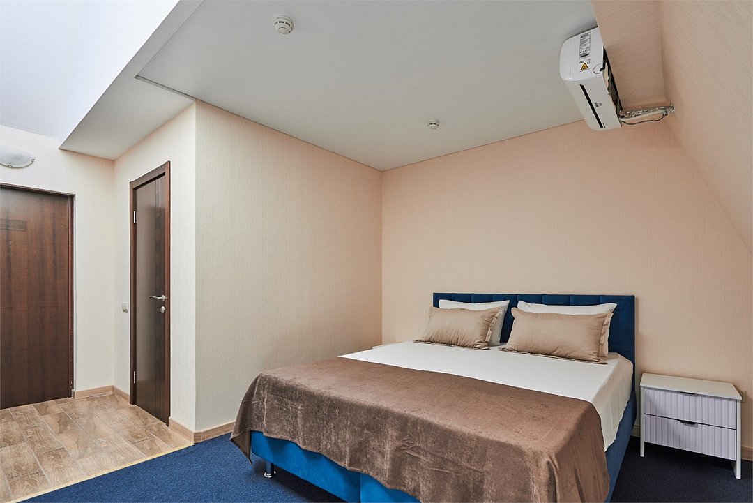 Номер люкс двухкомнатный - комфортный номер с двумя раздельными комнатами. В гостиной комнате расположен двуспальный диван, в спальной комнате - двуспальная кровать. Расположение номера на четвертом этаже. Напольное покрытие – ковролин. В номере имеется холодильник, телевизор, кондиционер сплит-система, фен, журнальный столик. В номере собственный санузел, в котором есть душ. Номера комплектуются набором полотенец на каждого гостя (банное, лицевое) и полотенце для ног. В ванной комнате есть косметические принадлежности: мыло, шампунь, гель для душа. В номере без предоставления дополнительного места и без дополнительной оплаты может проживать один ребенок в возрасте до 4 лет.Услуги и удобства