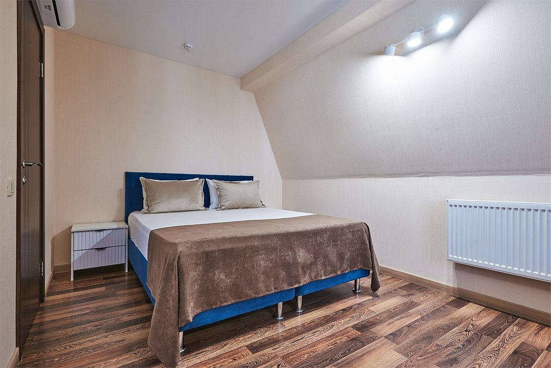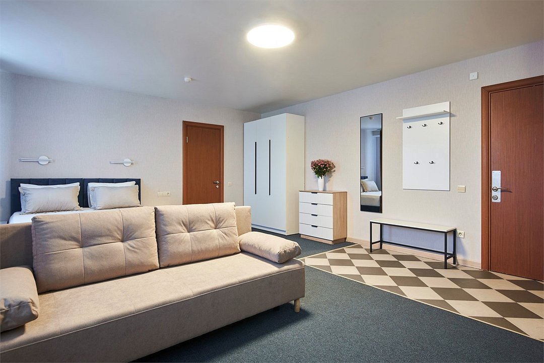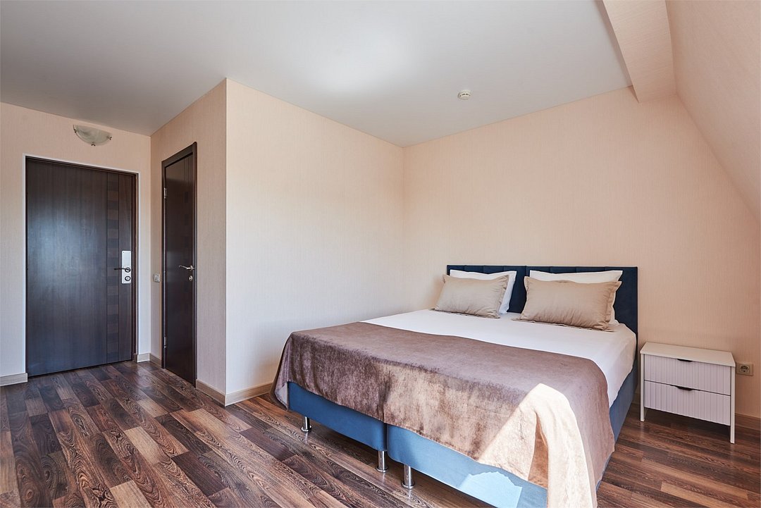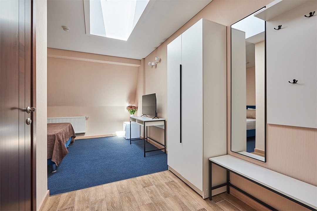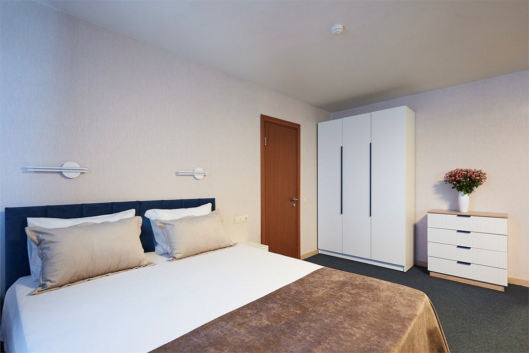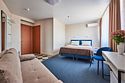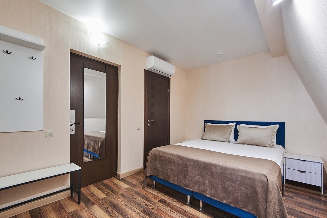 Номер люкс двухкомнатный - комфортный номер с двумя раздельными комнатами. В гостиной комнате расположен двуспальный диван, в спальной комнате - двуспальная кровать. Расположение номера на четвертом этаже. Напольное покрытие – ковролин. В номере имеется холодильник, телевизор, кондиционер сплит-система, фен, журнальный столик. В номере собственный санузел, в котором есть душ. Номера комплектуются набором полотенец на каждого гостя (банное, лицевое) и полотенце для ног. В ванной комнате есть косметические принадлежности: мыло, шампунь, гель для душа. В номере без предоставления дополнительного места и без дополнительной оплаты может проживать один ребенок в возрасте до 4 лет.Услуги и удобства