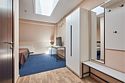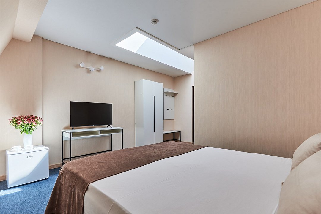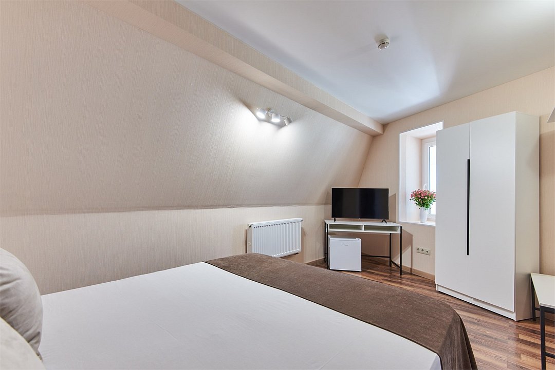 Номер стандарт на мансарде – это номер с двумя односпальными или одной двуспальной кроватью. Расположение номеров на пятом этаже. Напольное покрытие - ламинат. С комфортом можно разместиться одному или двум гостям, или семье из двух человек с ребенком возрастом до 4 лет включительно (ребенок без доплаты размещается на спальных местах с родителями). Окно номера мансардного типа, расположено на потолке. В номере имеется холодильник, телевизор, кондиционер сплит-система, фен, журнальный столик. В номере собственный санузел, в котором есть душ. Номера комплектуются набором полотенец на каждого гостя (банное, лицевое) и полотенце для ног. В ванной комнате есть косметические принадлежности: мыло, шампунь, гель для душа.Услуги и удобства