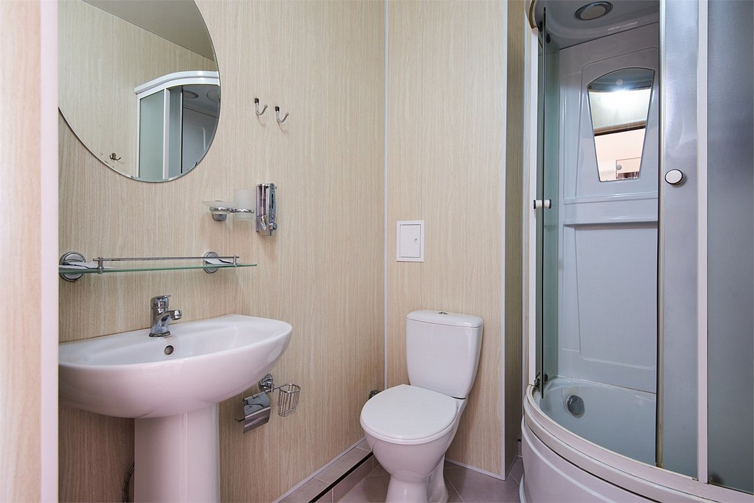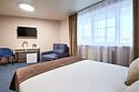 Номер полулюкс – это номер с двумя односпальными или одной двуспальной кроватью и двуспальным диваном. Расположение номеров со первого по четвертый этажи. Напольное покрытие – ковролин. В номере имеется холодильник, телевизор, кондиционер сплит-система, фен, журнальный столик. В номере собственный санузел, в котором есть душ. Номера комплектуются набором полотенец на каждого гостя (банное, лицевое) и полотенце для ног. В ванной комнате есть косметические принадлежности: мыло, шампунь, гель для душа. В номере без предоставления дополнительного места и без дополнительной оплаты может проживать один ребенок в возрасте до 4 лет.Услуги и удобства