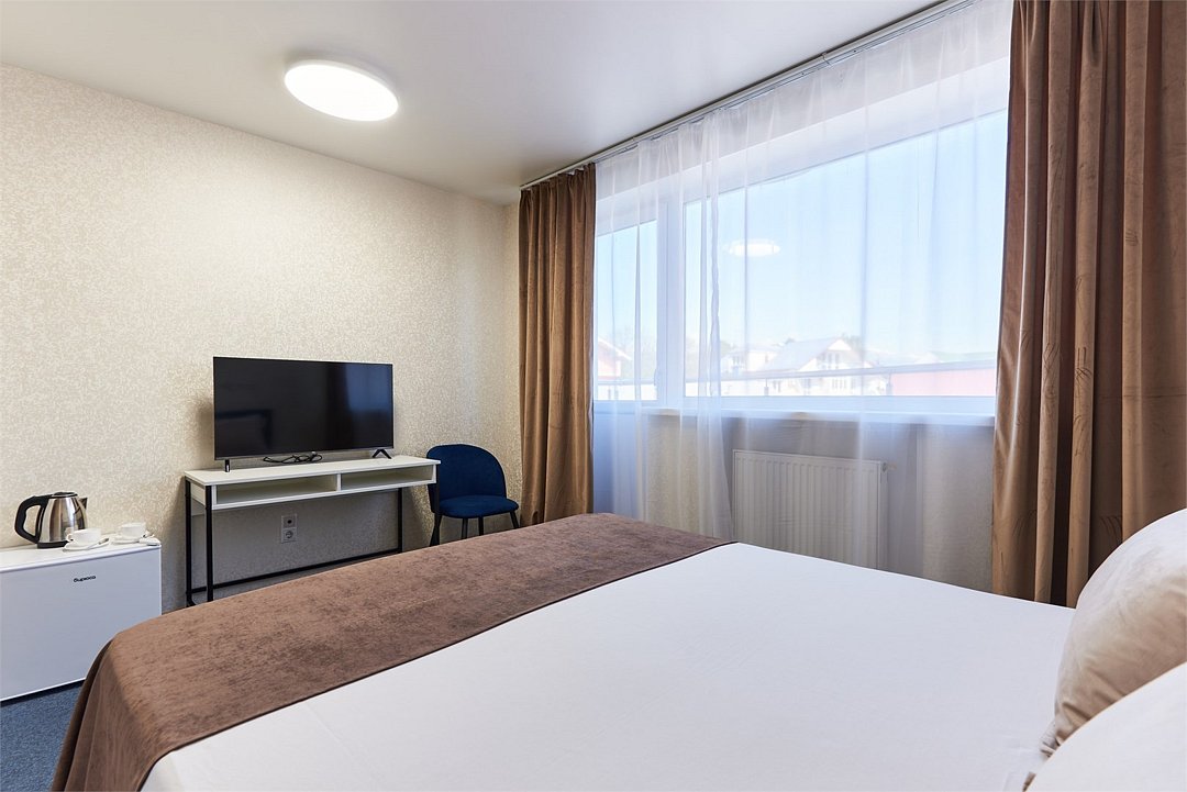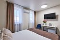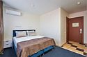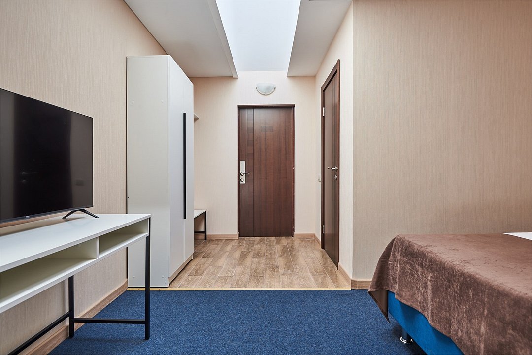 Номер бюджетный стандарт – это номер с двумя односпальными или одной двуспальной кроватью. Расположение номеров на пятом этаже. Напольное покрытие - ламинат. С комфортом можно разместиться одному или двум гостям, или семье из двух человек с ребенком возрастом до 4 лет включительно (ребенок без доплаты размещается на спальных местах с родителями). Окно номера выходит в холл здания. В номере имеется холодильник, телевизор, кондиционер сплит-система, фен, журнальный столик. В номере собственный санузел, в котором есть душ. Номера комплектуются набором полотенец на каждого гостя (банное, лицевое) и полотенце для ног. В ванной комнате есть косметические принадлежности: мыло, шампунь, гель для душа.Услуги и удобства