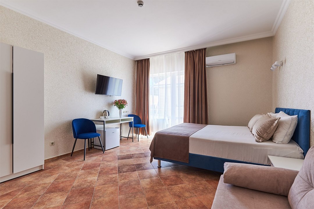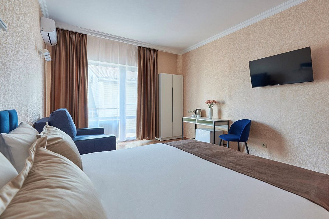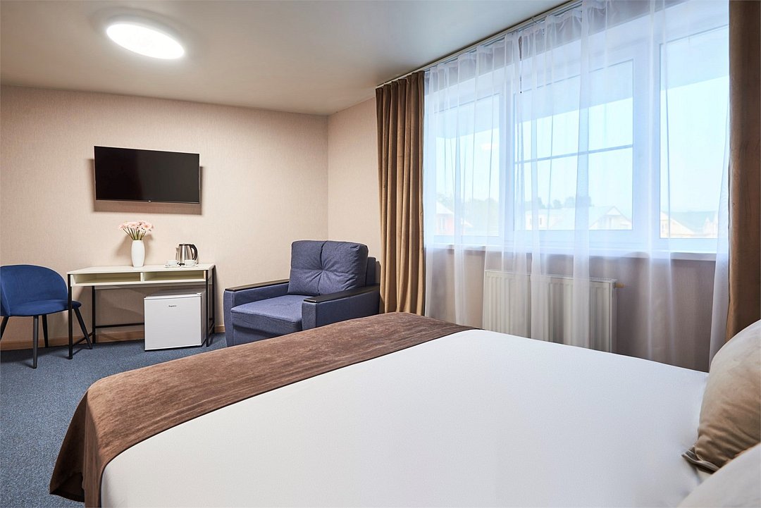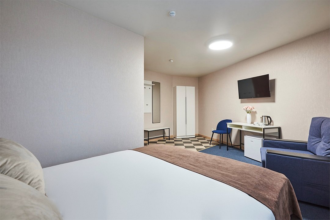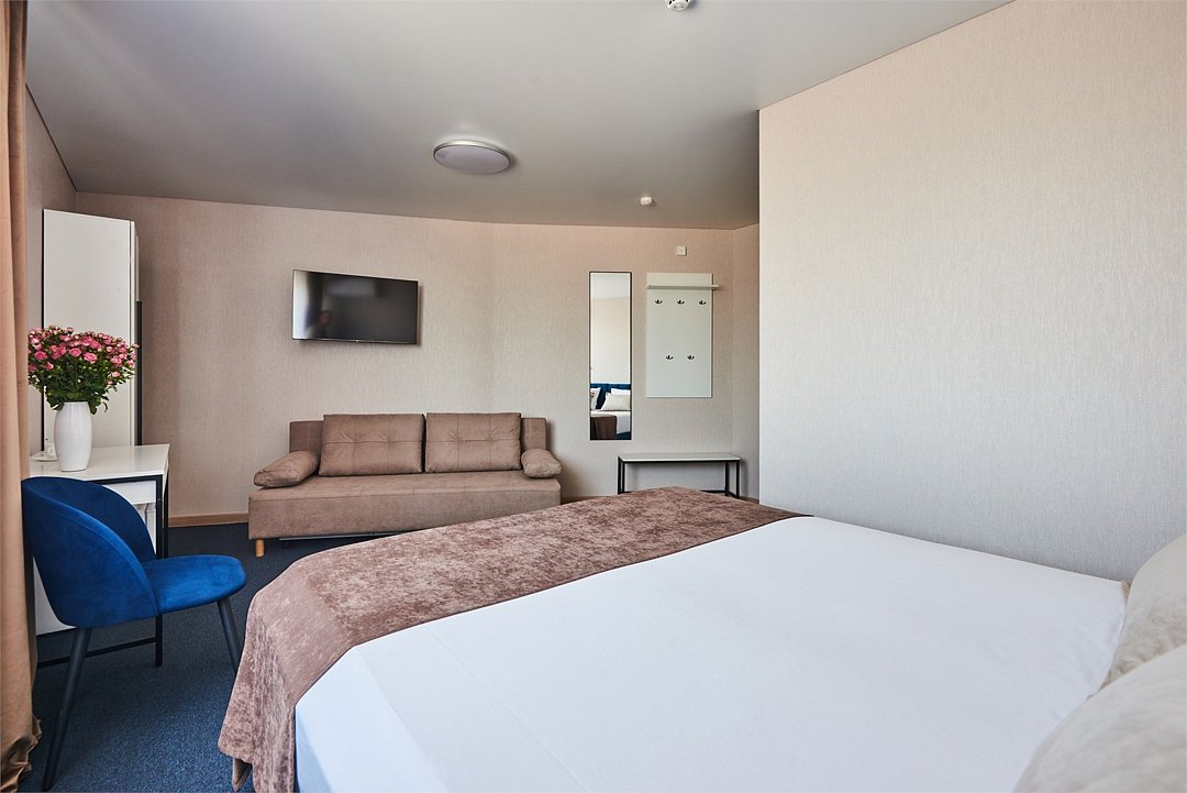 кабельное телевидение, Wi-Fi, кондиционер, фен, ванная комната, санузел, банные полотенца, тапочки, гигиенические средства, две односпальные или большая двуспальная кровать, гладильная доска, шкаф для одежды, вешалки, зеркало, мебельный гарнитур, обслуживание номеров, чайник, унитаз, раковина, ковровое покрытие, отопление, душ, вид на город, вид во двор, стаканы, стул, стол, туалет, сплит-система, диван-кровать, раскладной диван, телевизор с плоским экраном, мини-холодильник, номер для некурящих, уборка номера, вешалки-плечики, мыло, прачечная (за дополнительную плату)В гостиничном номере