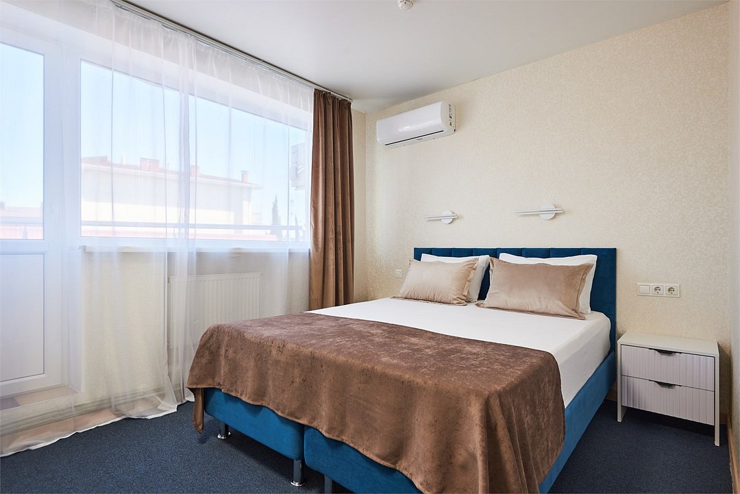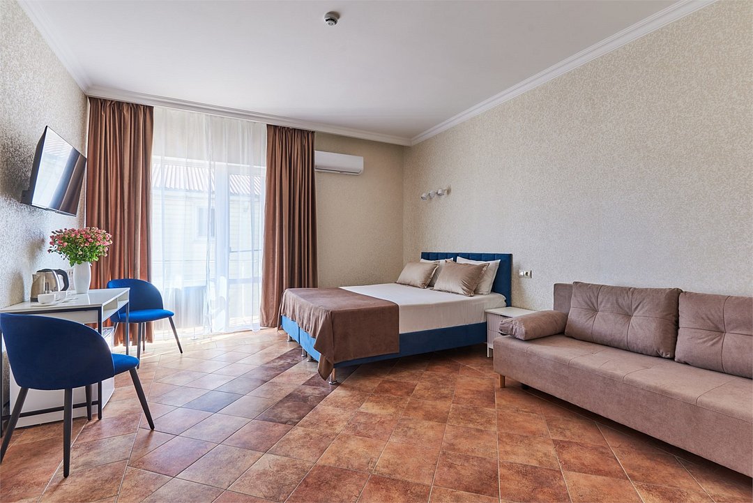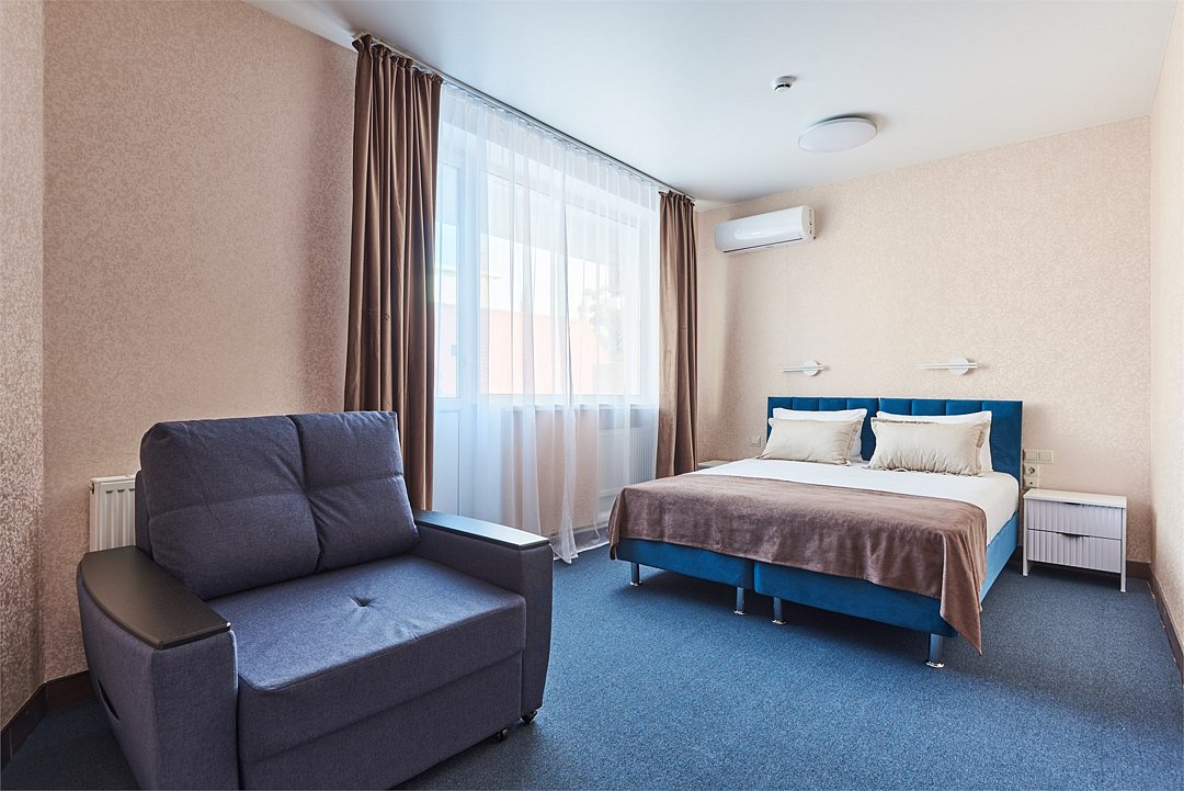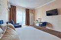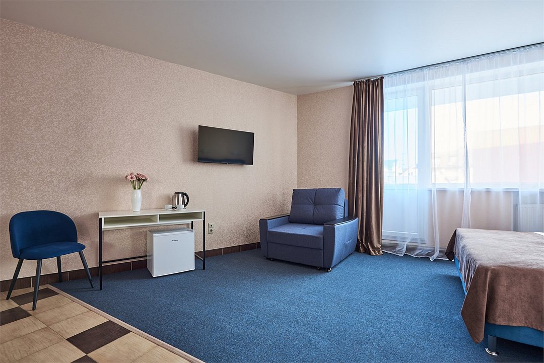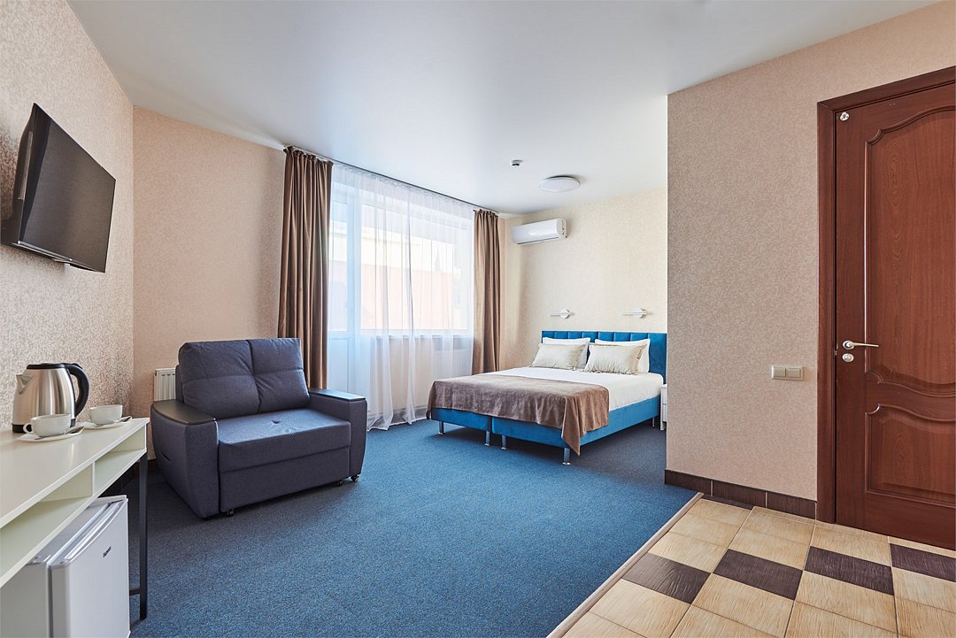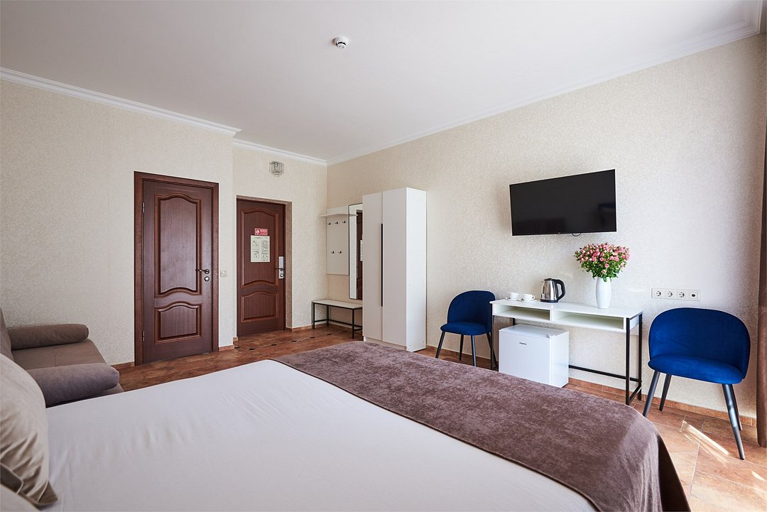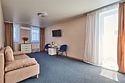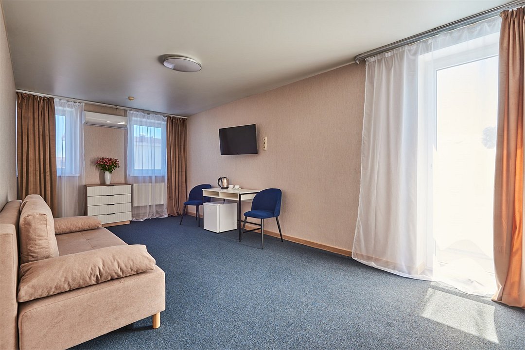 Номер полулюкс с балконом – это номер с двумя односпальными или одной двуспальной кроватью и двуспальным диваном. Расположение номеров со первого по третий этажи. Напольное покрытие – ковролин или кафель. В номере имеется холодильник, телевизор, кондиционер сплит-система, фен, журнальный столик. В номере собственный санузел, в котором есть душ. Номера комплектуются набором полотенец на каждого гостя (банное, лицевое) и полотенце для ног. В ванной комнате есть косметические принадлежности: мыло, шампунь, гель для душа. В номере без предоставления дополнительного места и без дополнительной оплаты может проживать один ребенок в возрасте до 4 лет.Услуги и удобства