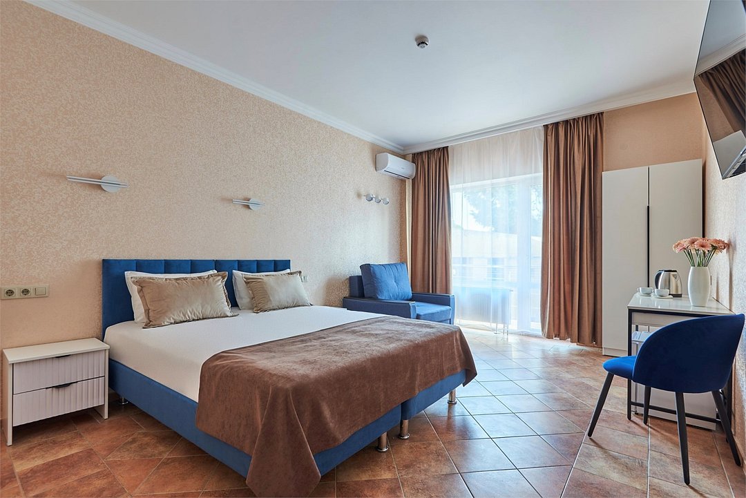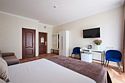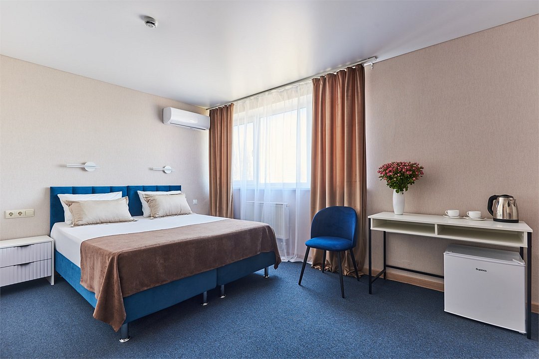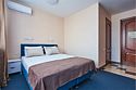 Номер делюкс – это номер с двумя односпальными или одной двуспальной кроватью и креслом кроватью. Расположение номеров со второго по четвертый этажи. Напольное покрытие – ковролин или кафель. В номере имеется холодильник, телевизор, кондиционер сплит-система, фен, журнальный столик. В номере собственный санузел, в котором есть душ. Номера комплектуются набором полотенец на каждого гостя (банное, лицевое) и полотенце для ног. В ванной комнате есть косметические принадлежности: мыло, шампунь, гель для душа. В номере без предоставления дополнительного места и без дополнительной оплаты может проживать один ребенок в возрасте до 4 лет.Услуги и удобства
