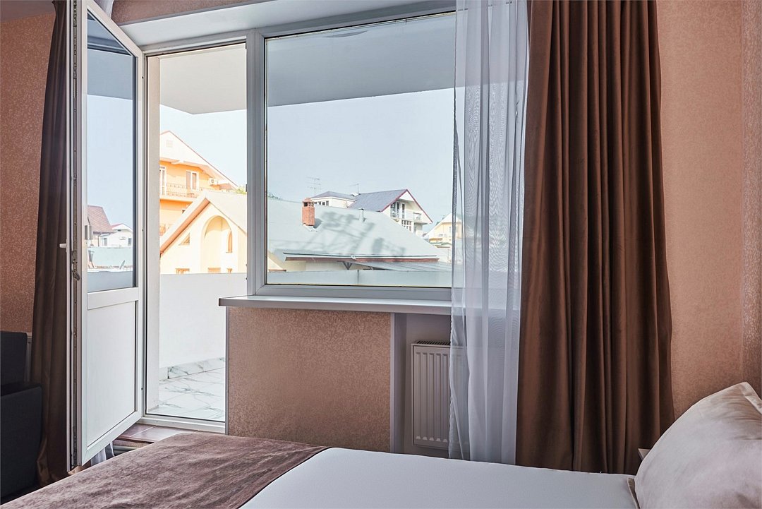 Номер делюкс с балконом – это номер с двумя односпальными или одной двуспальной кроватью и креслом кроватью. Расположение номеров со первого по третий этажи. Напольное покрытие – ковролин или кафель. В номере есть балкон. В номере имеется холодильник, телевизор, кондиционер сплит-система, фен, журнальный столик. В номере собственный санузел, в котором есть душ. Номера комплектуются набором полотенец на каждого гостя (банное, лицевое) и полотенце для ног. В ванной комнате есть косметические принадлежности: мыло, шампунь, гель для душа. В номере без предоставления дополнительного места и без дополнительной оплаты может проживать один ребенок в возрасте до 4 лет.Услуги и удобства