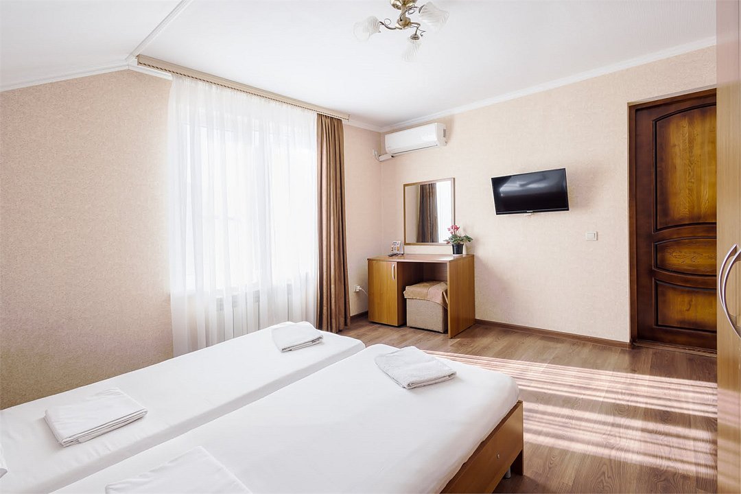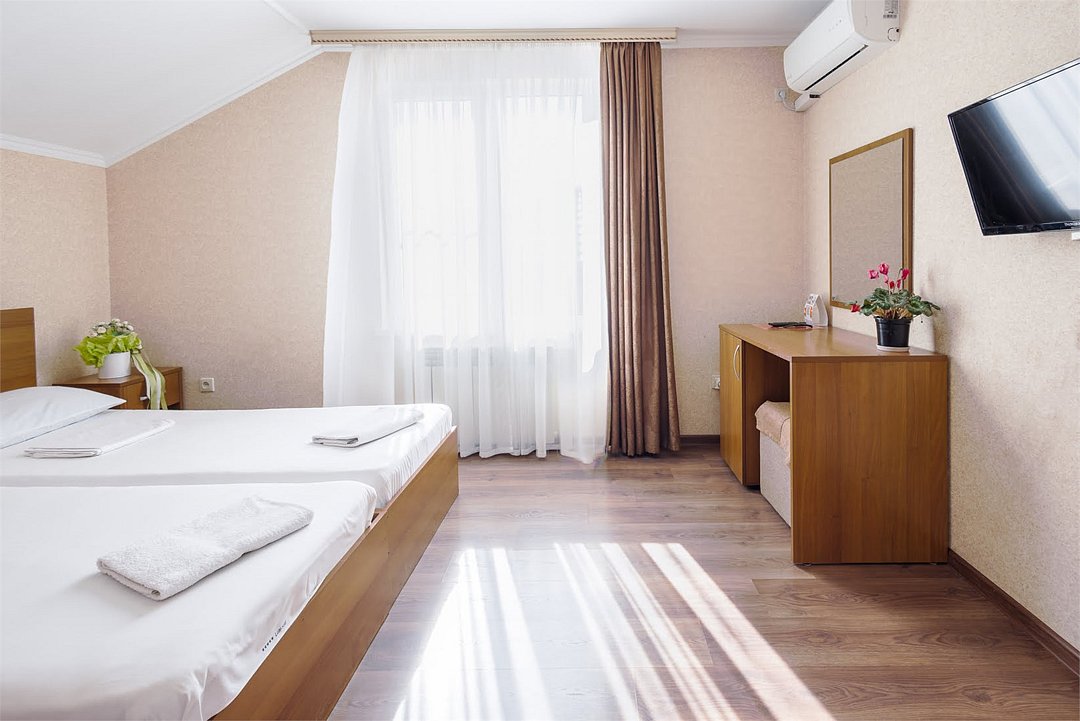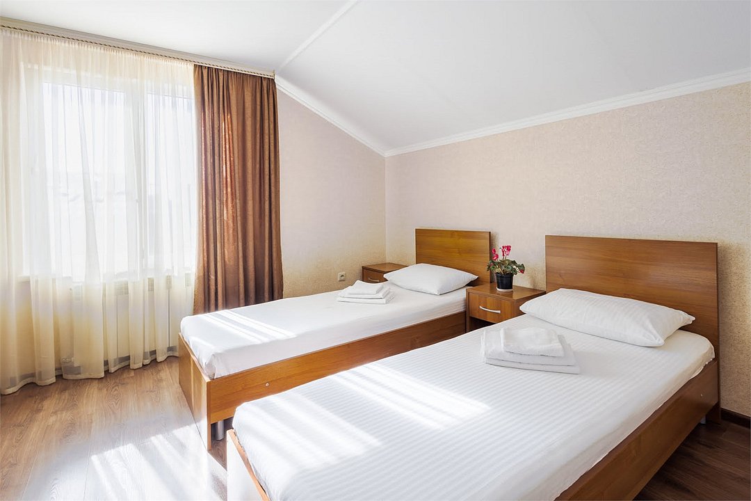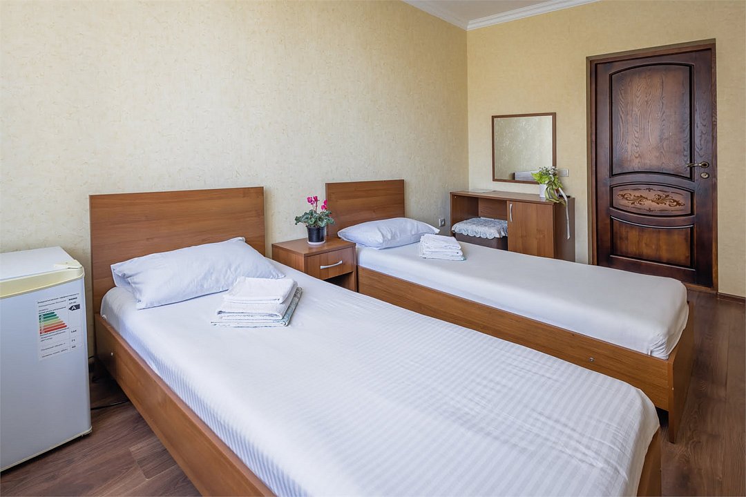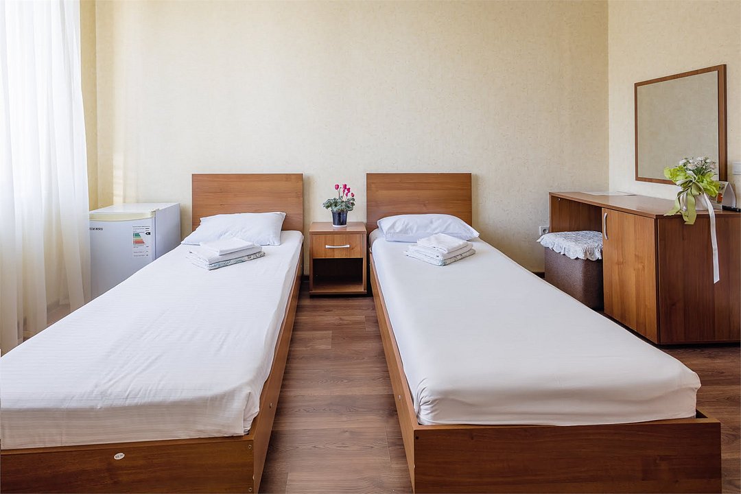 Уютный двухместный номер оснащен всем необходимым для комфортного проживания: удобные кровати, современный санузел,кондиционер, холодильник и бесплатный Wi-Fi. В номере также имеется рабочий стол, телевизор, фен, тапочки, халаты а также туалетные принадлежности . Уборка проводится по вашему требованию, что обеспечивает чистоту и порядок.Услуги и удобства