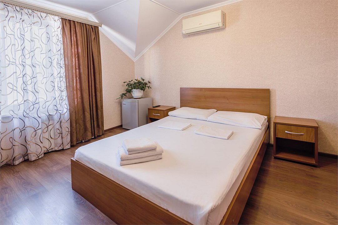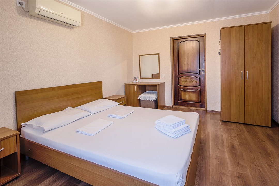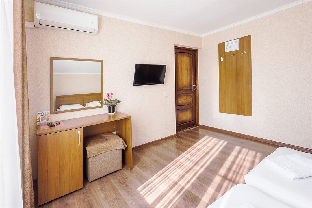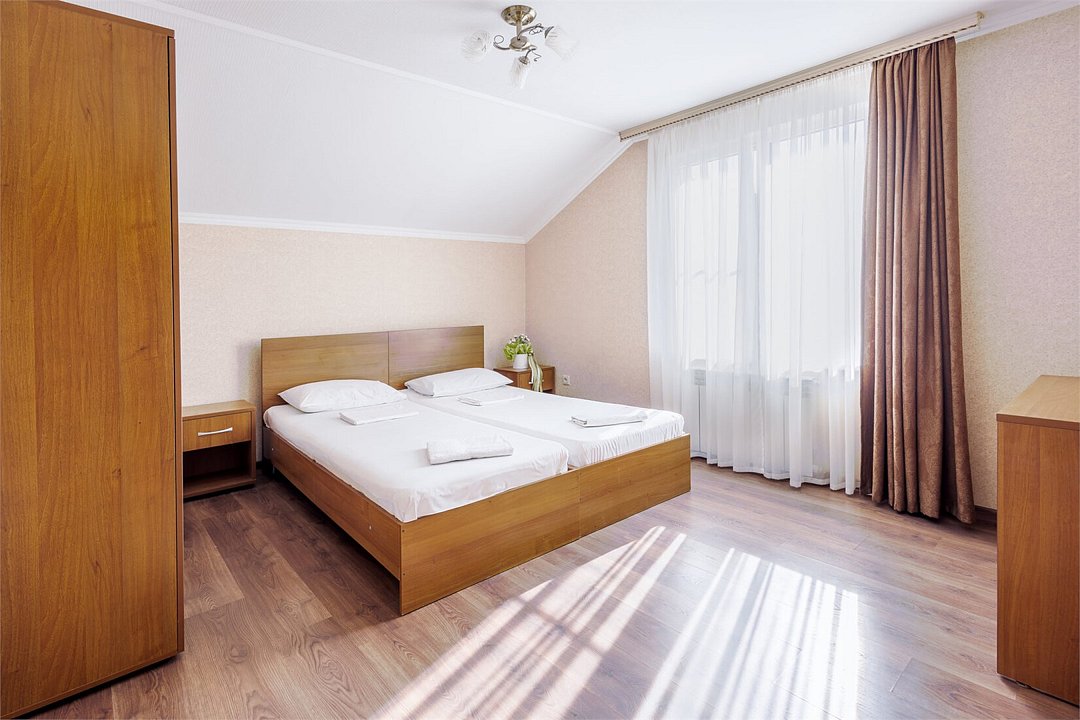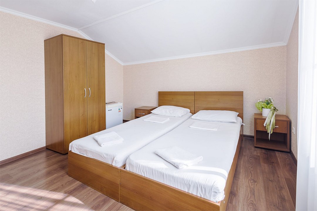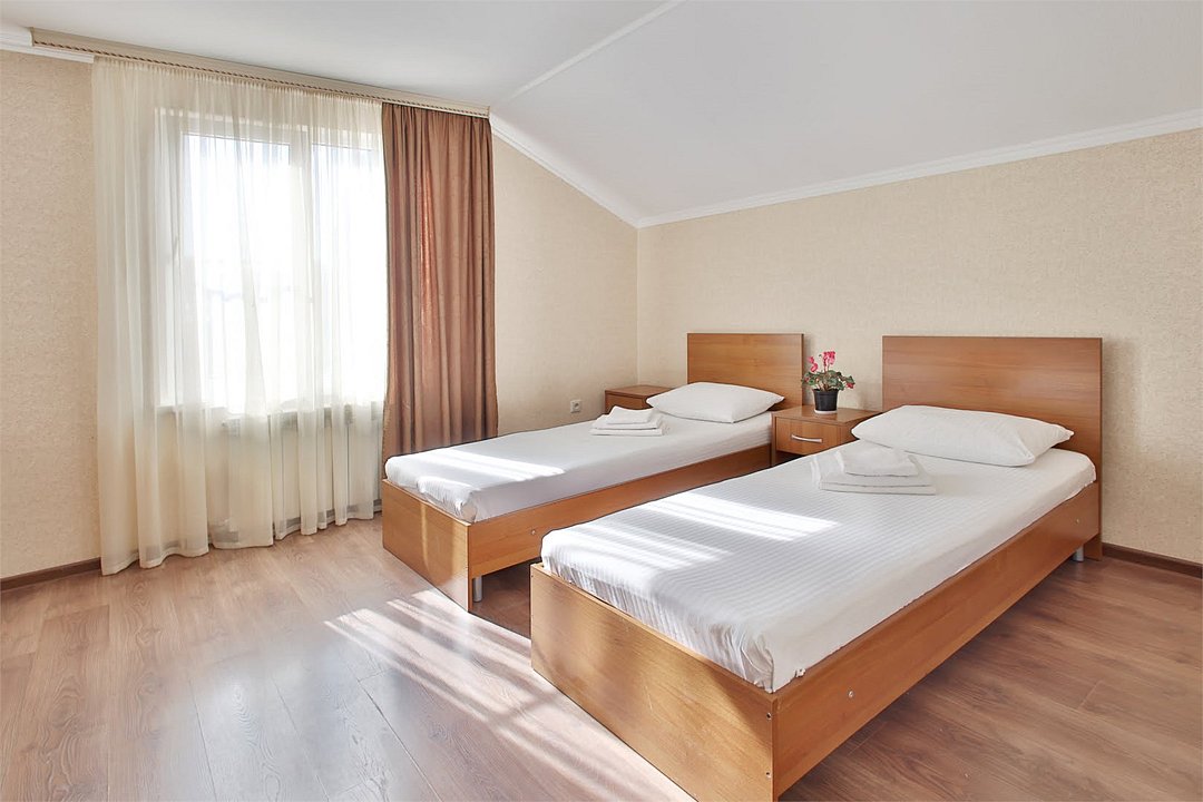 Уютный двухместный номер оснащен всем необходимым для комфортного проживания: удобные кровати, современный санузел,кондиционер, холодильник и бесплатный Wi-Fi. В номере также имеется рабочий стол, телевизор, фен, тапочки, халаты а также туалетные принадлежности . Уборка проводится по вашему требованию, что обеспечивает чистоту и порядок.Услуги и удобства