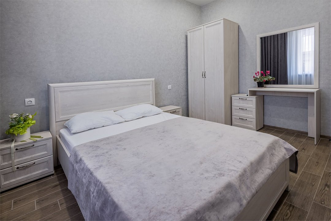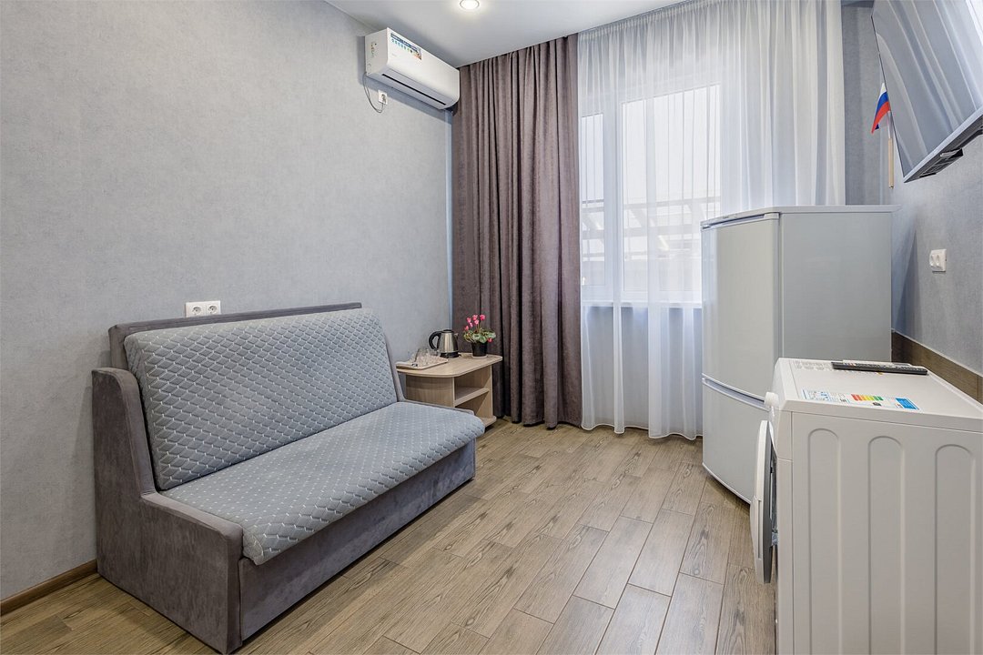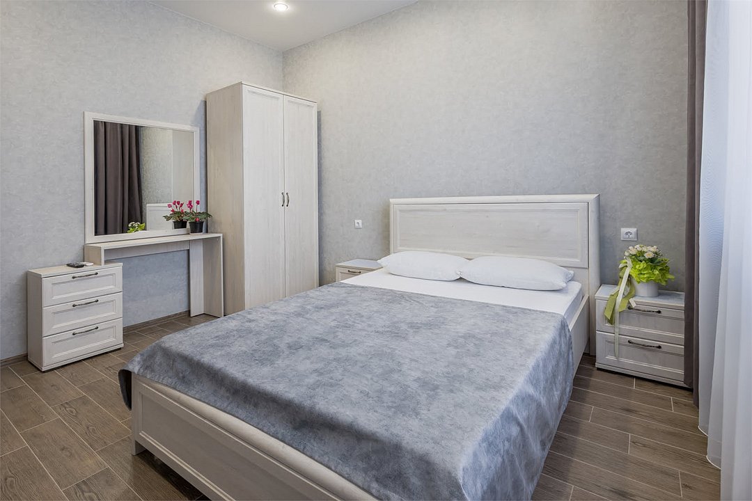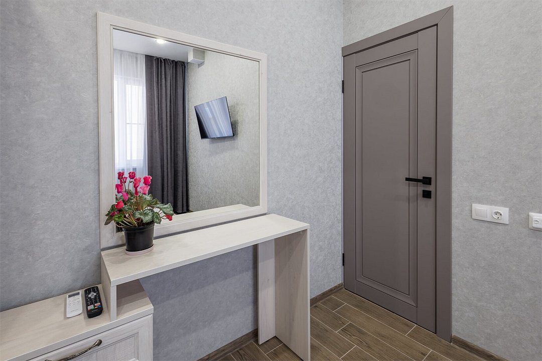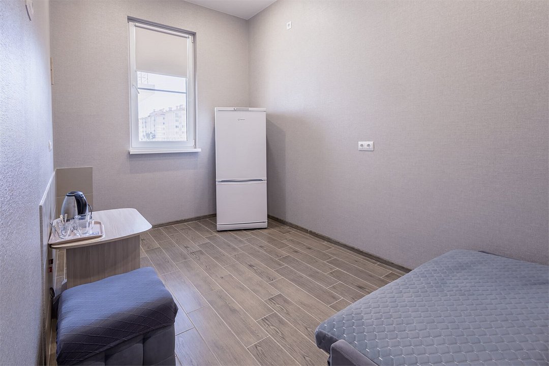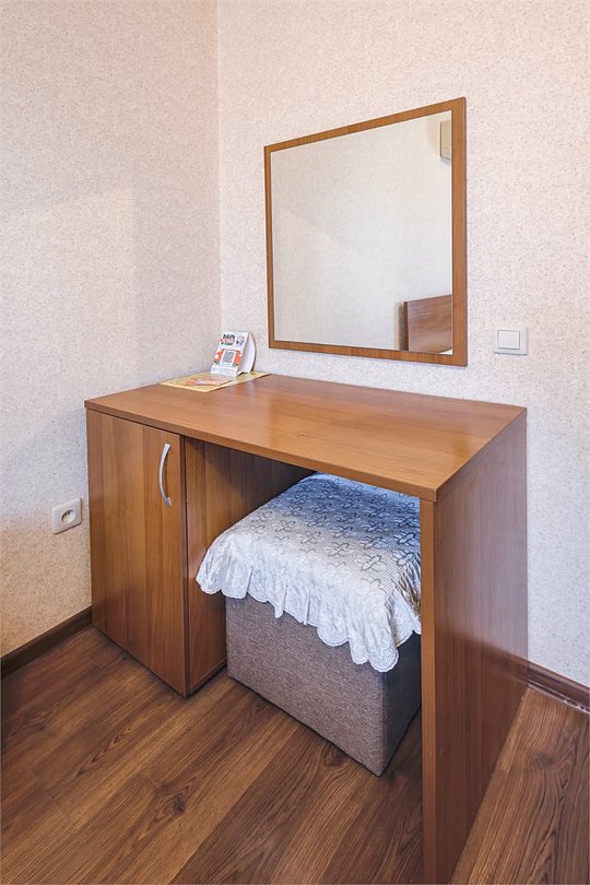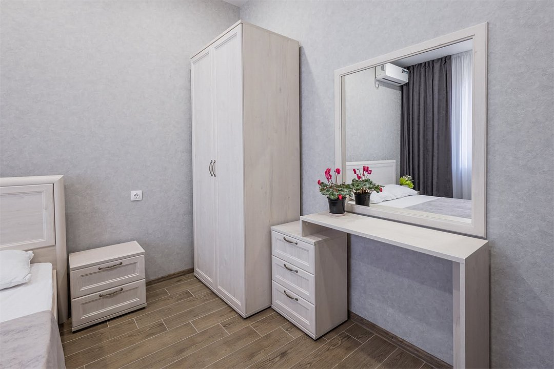 Уютный двухкомнатный четырехместный номер с новым ремонтом оснащен всем необходимым для комфортного проживания: удобные кровати, современный санузел, стиральная машина в номере, кондиционер, холодильник и бесплатный Wi-Fi. В номере также имеется рабочий стол, телевизор, фен, тапочки, халаты а также туалетные принадлежности . Уборка проводится по вашему требованию, что обеспечивает чистоту и порядок.Услуги и удобства