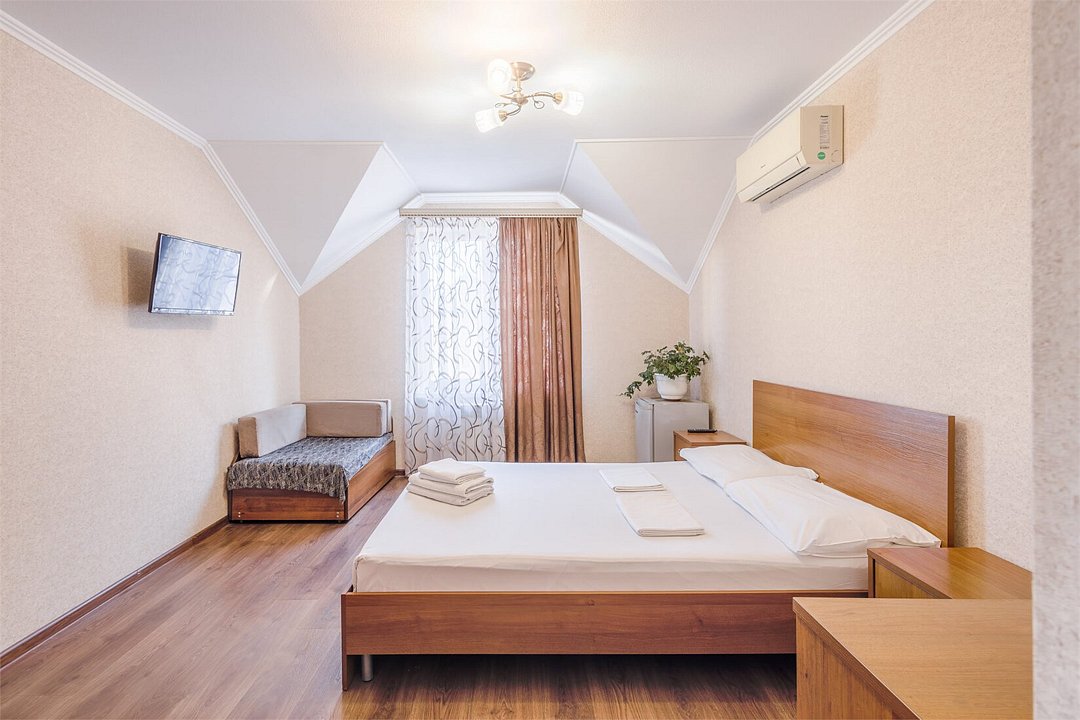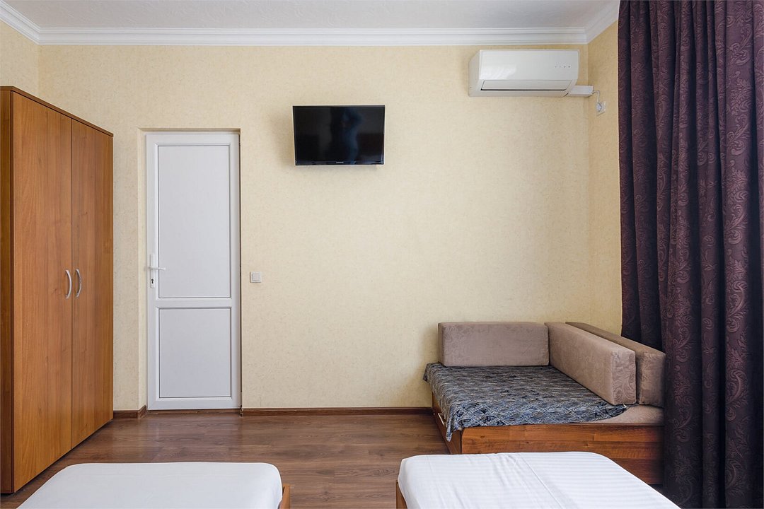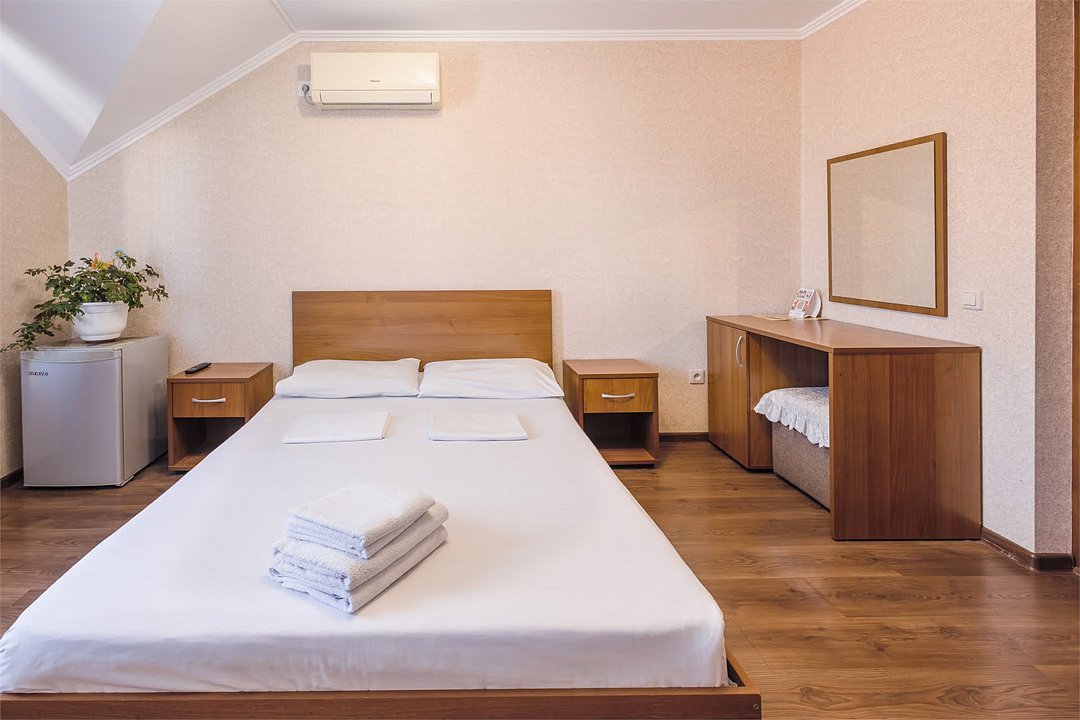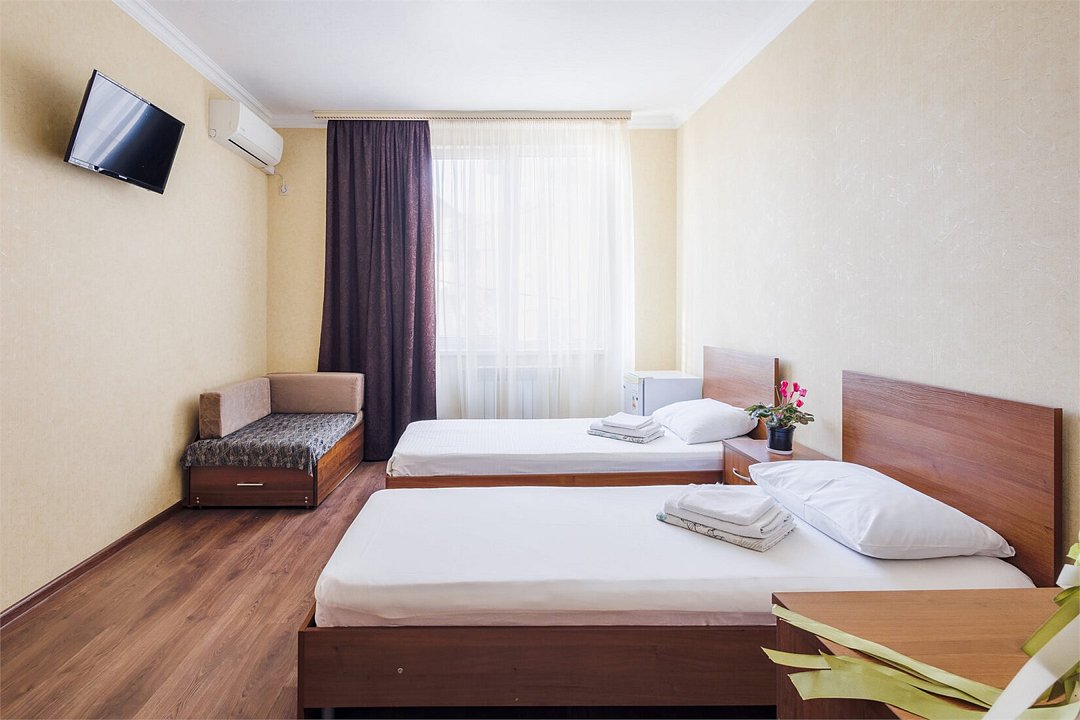 Уютный трехместный номер оснащен всем необходимым для комфортного проживания: удобные кровати, современный санузел,кондиционер, холодильник и бесплатный Wi-Fi. В номере также имеется рабочий стол, телевизор, фен, тапочки, халаты а также туалетные принадлежности . Уборка проводится по вашему требованию, что обеспечивает чистоту и порядок.Услуги и удобства