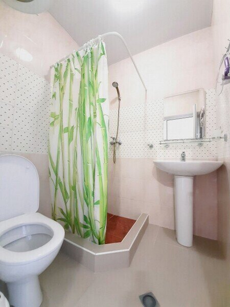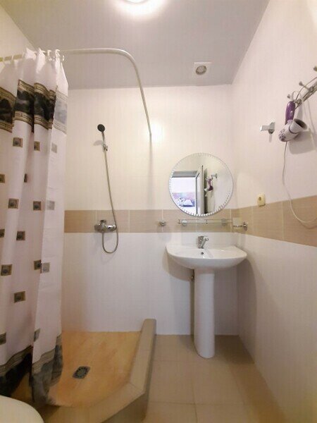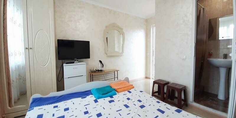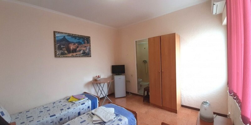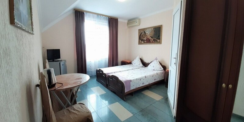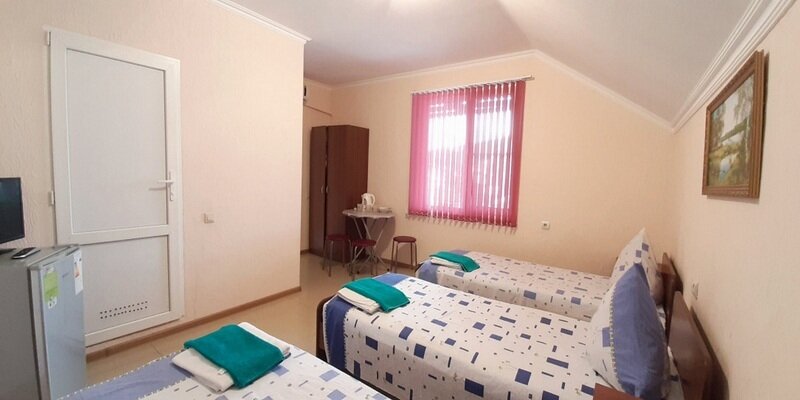 Подходит для размещения 2 человек. Имеет спальню с приятным интерьером. В номере: 2 односпальные кровати. Имеется телевизор, кондиционер, шкаф, вешалка, обеденный стол, комод, чайник, фен, холодильник, стулья. Индивидуальная ванная комната: душ, раковина, туалет.