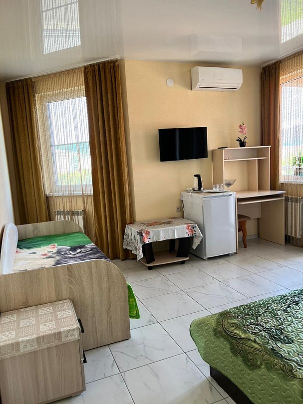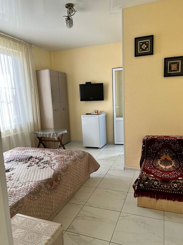 Двухместный комфортный номер площадью 15 кв.м с видом во двор. Подходит для размещения 3 человек. (2 основных места и 1 дополнительное) Имеет спальню с приятным интерьером. В номере: 1 двуспальная кровать, 1 диван односпальный. Имеется телевизор, кондиционер, шкаф, вешалка, зеркало, журнальный столик, холодильник, стулья, антимоскитная сетка Индивидуальная ванная комната: душ, раковина, туалет. В стоимость входит: Постельное бельё, полотенца, мыло. WI-Fi бесплатно на всей территории. Бесплатная общественная парковка за территорией.В гостиничном номере