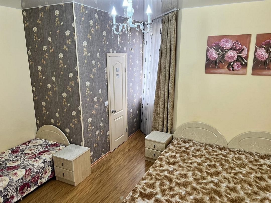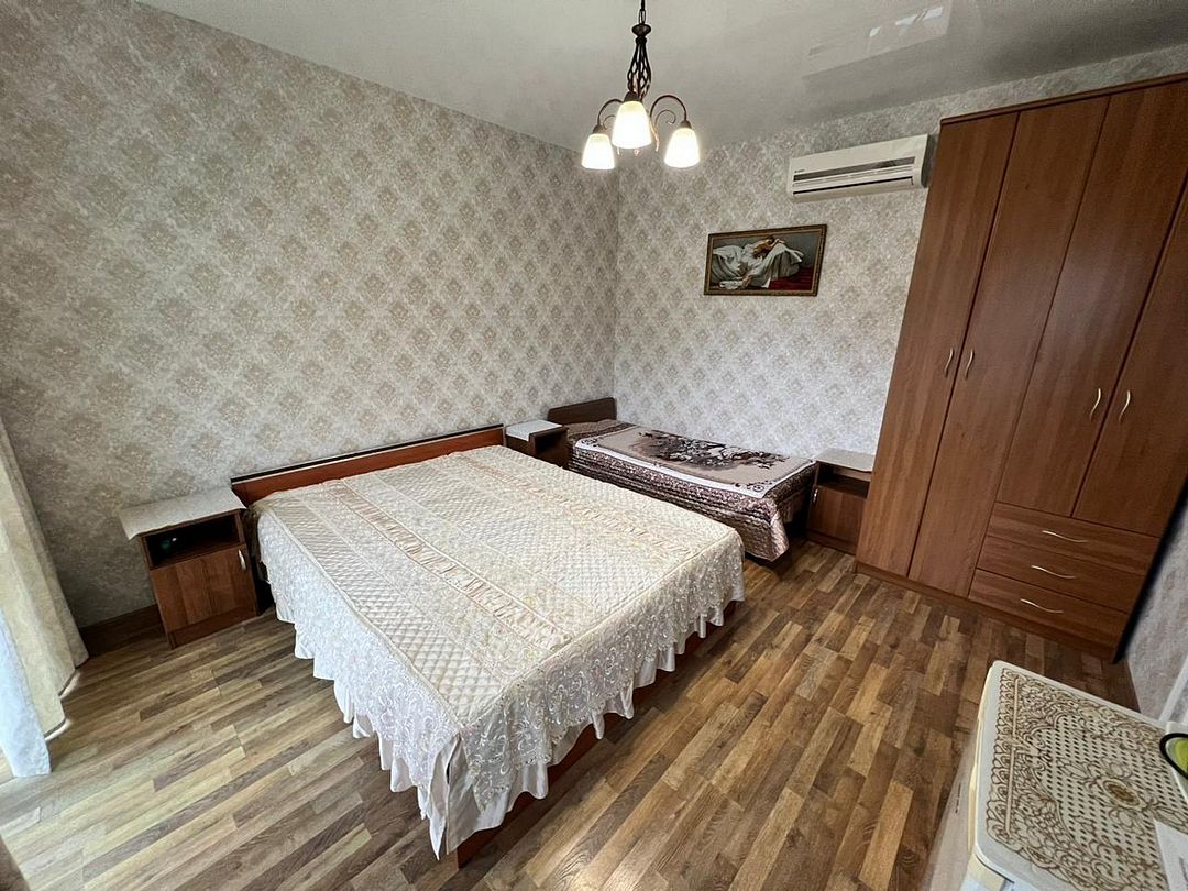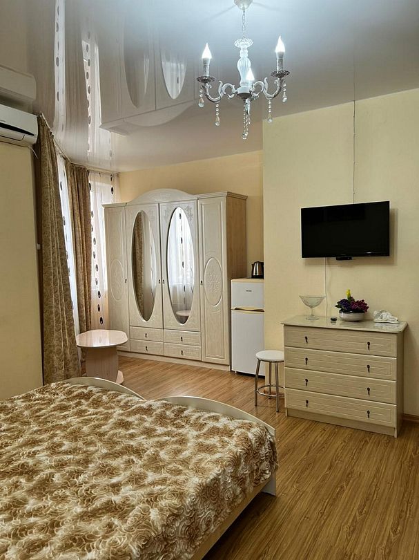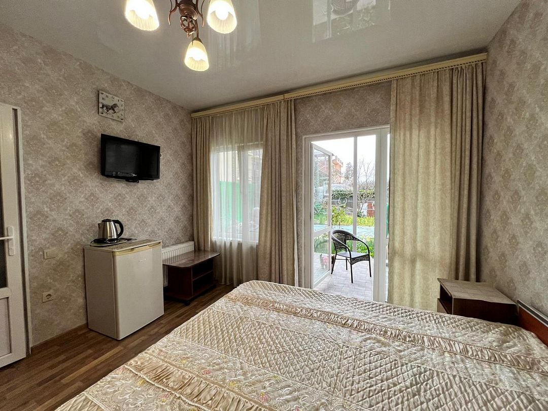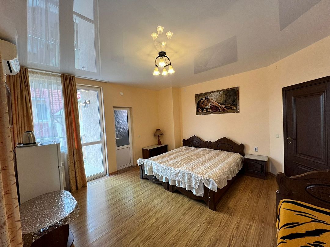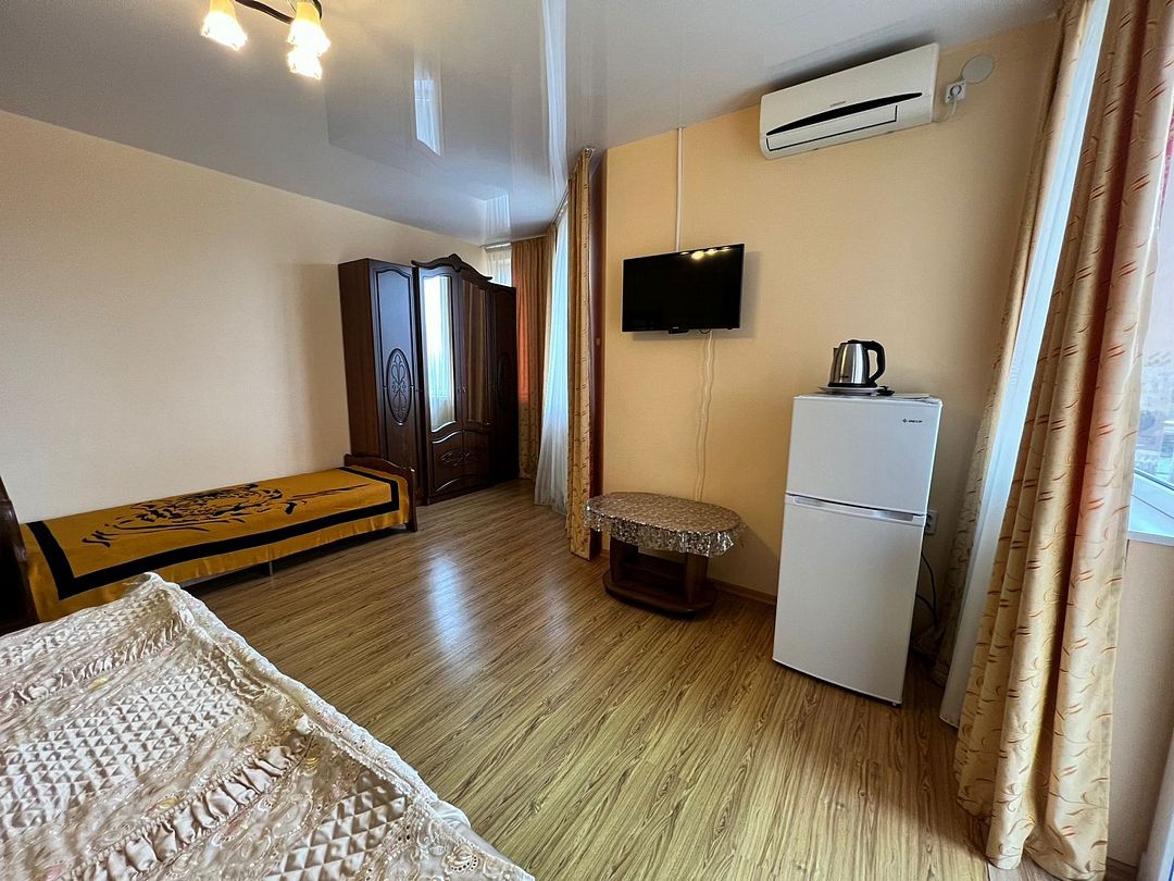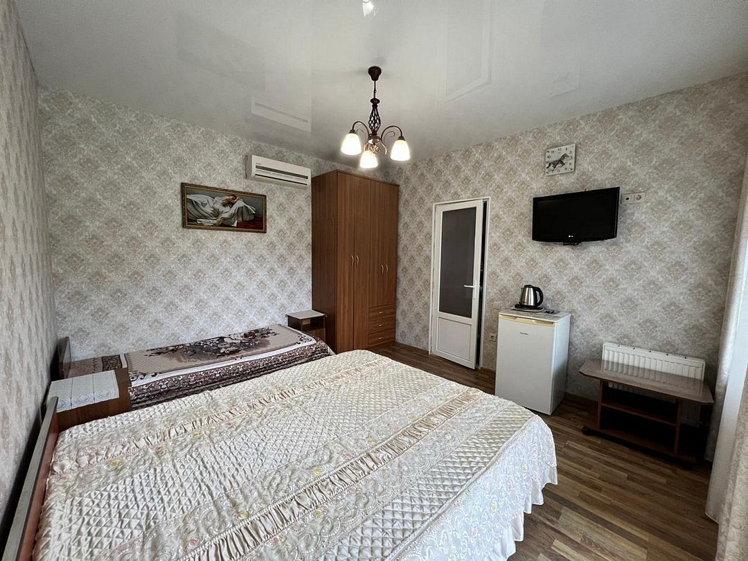Трёхместный стандартный номер площадью 22 кв.м с видом во двор. Подходит для размещения 3 человек. Имеет спальню с приятным интерьером. В номере: 1 двуспальная кровать, 1 односпальная. Имеется телевизор, кондиционер, шкаф, вешалка, зеркало, журнальный столик, холодильник, стулья, антимоскитная сетка, чайник. Индивидуальная ванная комната: ванна, раковина, туалет. В стоимость входит: Постельное бельё, полотенца, мыло. WI-Fi бесплатно на всей территории. Бесплатная общественная парковка за территорией.В гостиничном номере