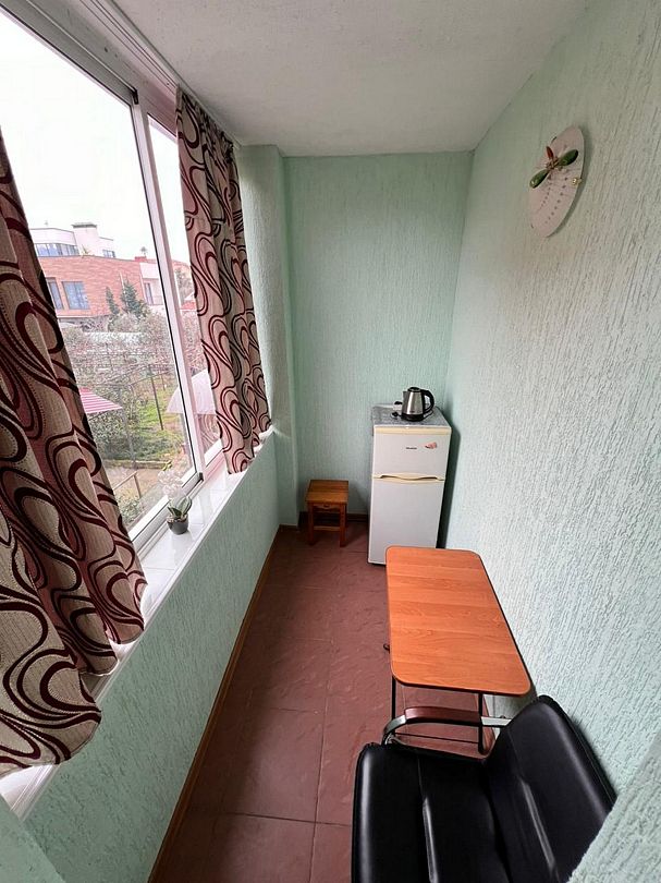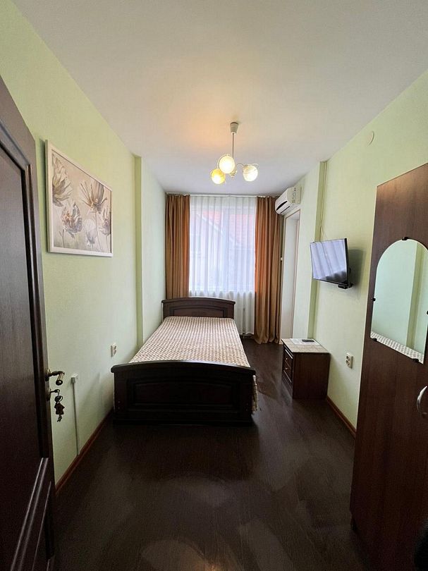 Трёхместный комфортный номер с балконом площадью 22 кв.м с видом во двор. Подходит для размещения 4 человек. (3 основных места и 1 дополнительное). Имеет спальню с приятным интерьером. В номере: 1 двуспальная кровать, 1 односпальная. Имеется телевизор, кондиционер, шкаф, вешалка, зеркало, журнальный столик, холодильник, стулья, антимоскитная сетка, чайник. Индивидуальная ванная комната: ванна, раковина, туалет. В стоимость входит: Постельное бельё, полотенца, мыло. WI-Fi бесплатно на всей территории. Бесплатная общественная парковка за территорией.В гостиничном номере