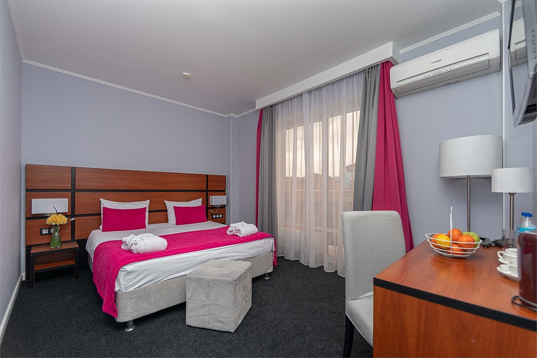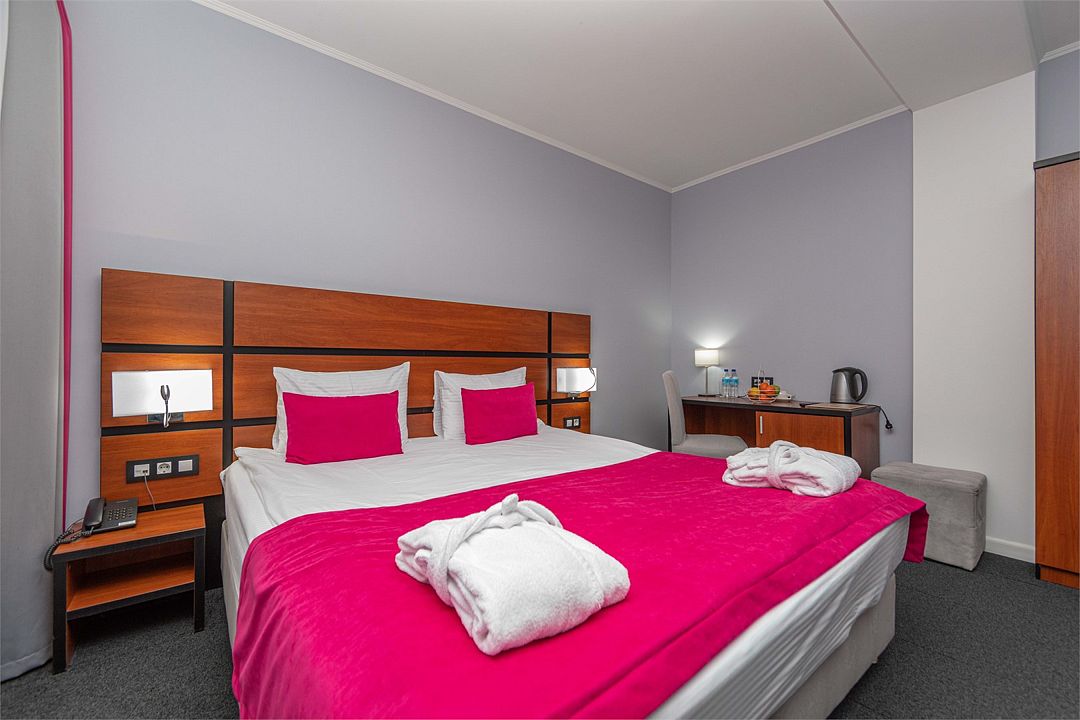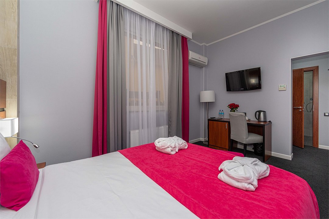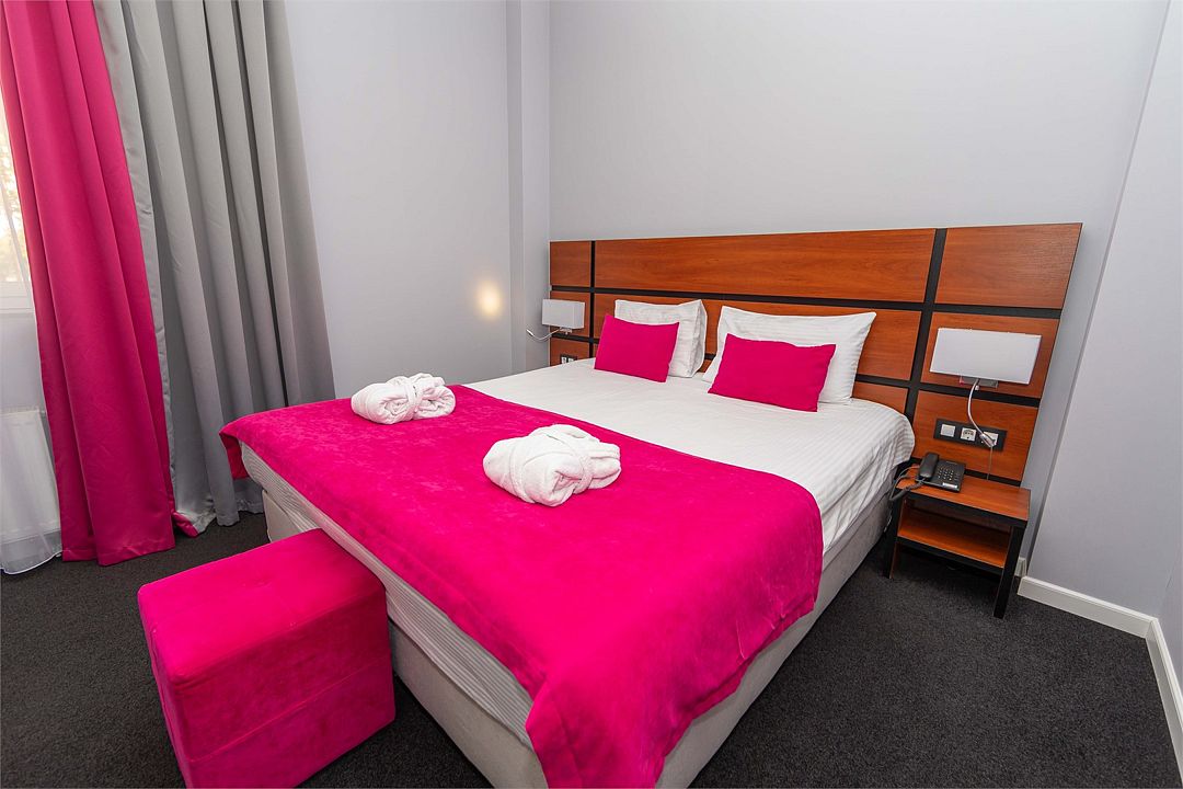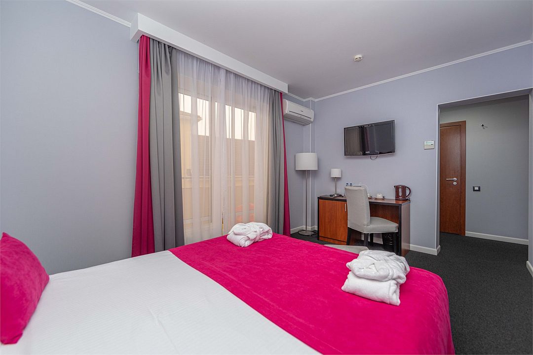 Двухместный номер с одной двуспальной кроватью, идеален для размещения двух человек. Дети до 5 лет размещаются бесплатно без предоставления места. Номера расположены со второго по пятый этажи. Большое панорамное окно с выходом на индивидуальный балкон. Собственная душевая с банными принадлежностями.Услуги и удобства