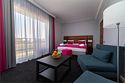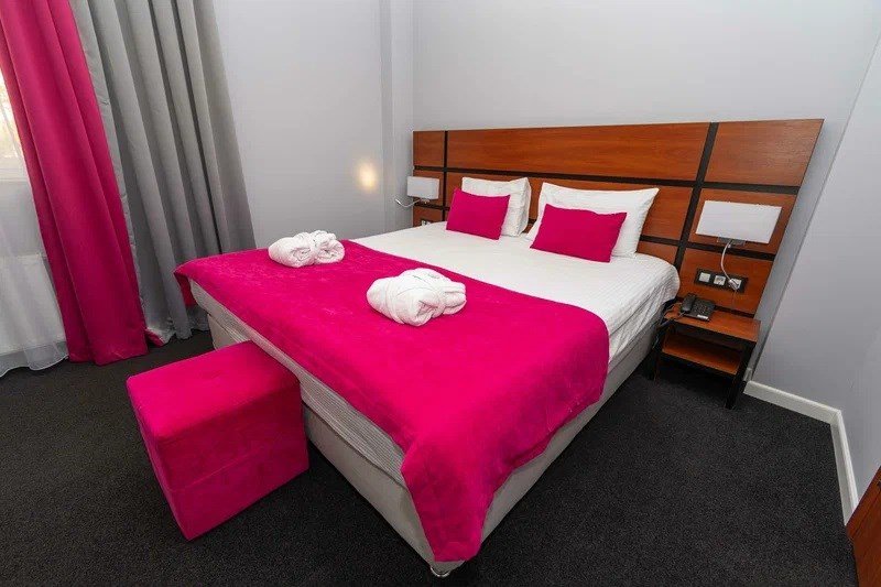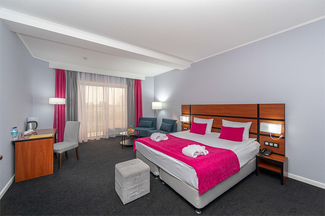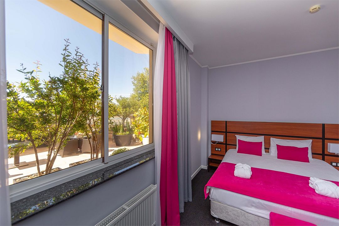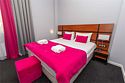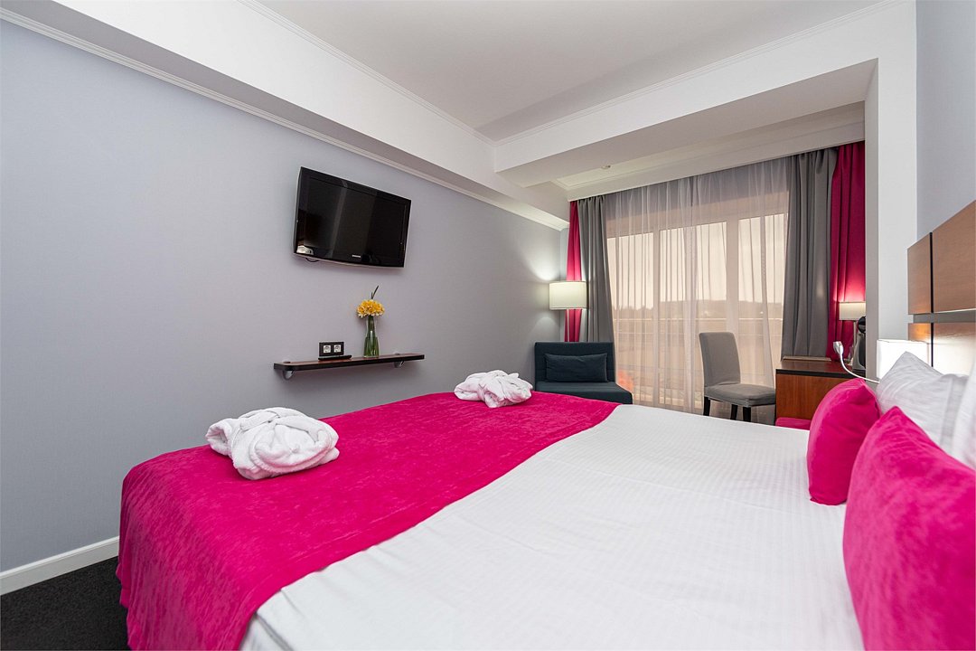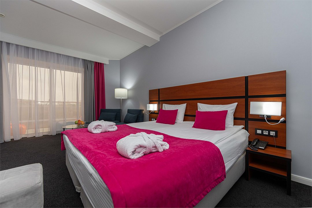 Двухместный номер с одной двуспальной кроватью, идеален для размещения двух человек. Дети до 5 лет размещаются бесплатно без предоставления места. Номера расположены со второго по пятый этажи. Большое панорамное окно с выходом на индивидуальный балкон. Собственная душевая с банными принадлежностями.Услуги и удобства