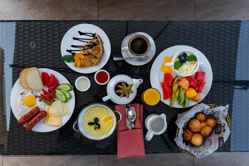 В стоимость проживания входит завтрак по системе «шведский стол», который сервируется с 8:00 до 11:00. Меню ресторана предлагает широкий выбор блюд: горячие основные блюда, гарниры, супы, свежие салаты, пасту, хинкали, бургеры, закуски, блюда с мангала, соусы, свежую выпечку, хлеб и десерты.