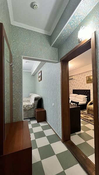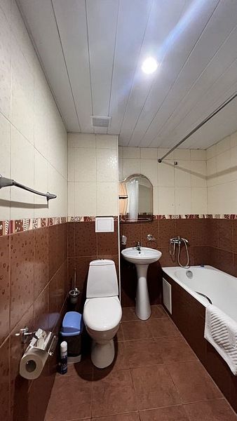 Wi-Fi, кондиционер, фен, утюг, ванная комната, ванна или душевая кабина, банные полотенца, тапочки, балкон, двуспальная кровать, односпальная кровать, гладильная доска, тумбы, стулья, шкаф для одежды, вешалки, журнальный столик, письменный стол, зеркало, две комнаты, чайник, унитаз, раковина, отопление, вид на город, кулер на этаже, плиточное покрытие, вид во двор, стаканы, стул, туалетные средства, туалет, сушилка для белья, диван-кровать, раскладной диван, телевизор с плоским экраном, мини-холодильник, рабочий столВ гостиничном номере