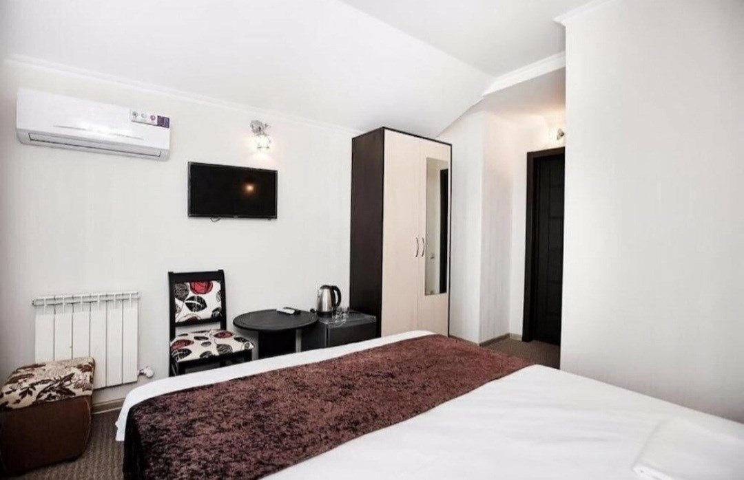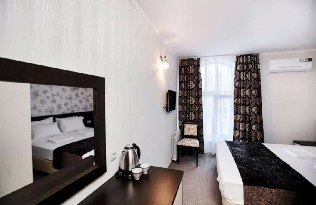Wi-Fi, кондиционер, светильник, фен, утюг, ванная комната, санузел, банные полотенца, тапочки, косметические средства, балкон, две односпальные или большая двуспальная кровать, гладильная доска, шкаф для одежды, вешалки, журнальный столик, письменный стол, зеркало, унитаз, раковина, отопление, душ, вид на город, вид во двор, стаканы, стул, стол, туалетные средства, туалет, сушилка для белья, телевизор с плоским экраном, мини-холодильник, рабочий столВ номере