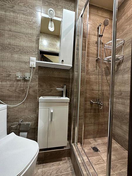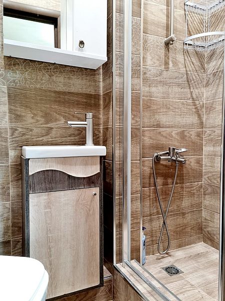 Индивидуальная ванная комната: душ, раковина, туалет.