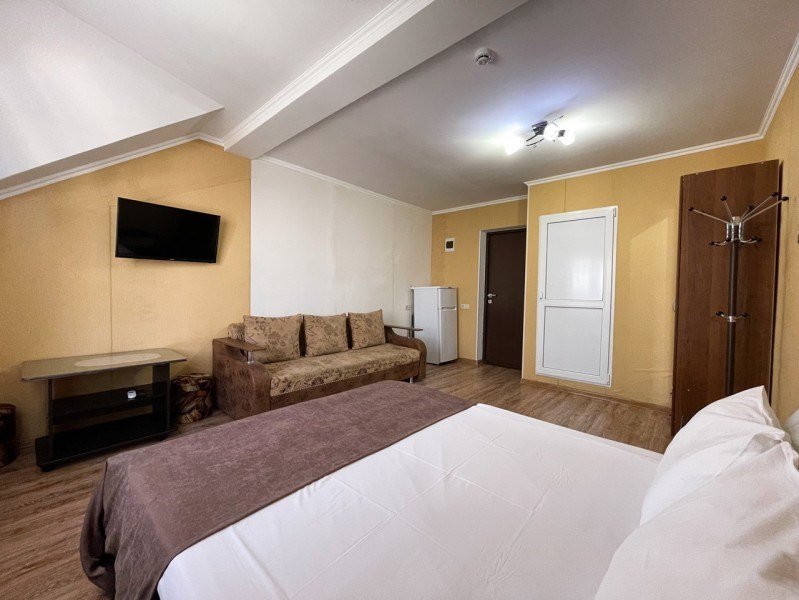 Стандартный трехместный номер – это номер тремя спальными местами - с одной двуспальной кроватью и дополнительным спальным местом - креслом кроватью. Напольное покрытие - кафельная плитка или ламинат. Расположение номеров с первого по пятый этажи. В номере имеется холодильник, телевизор, кондиционер сплит-система, фен. В номере собственный санузел, в котором есть душ. Номера комплектуются набором полотенец на каждого гостя (банное, лицевое). В ванной комнате есть жидкое мыло, туалетная бумага.Услуги и удобства