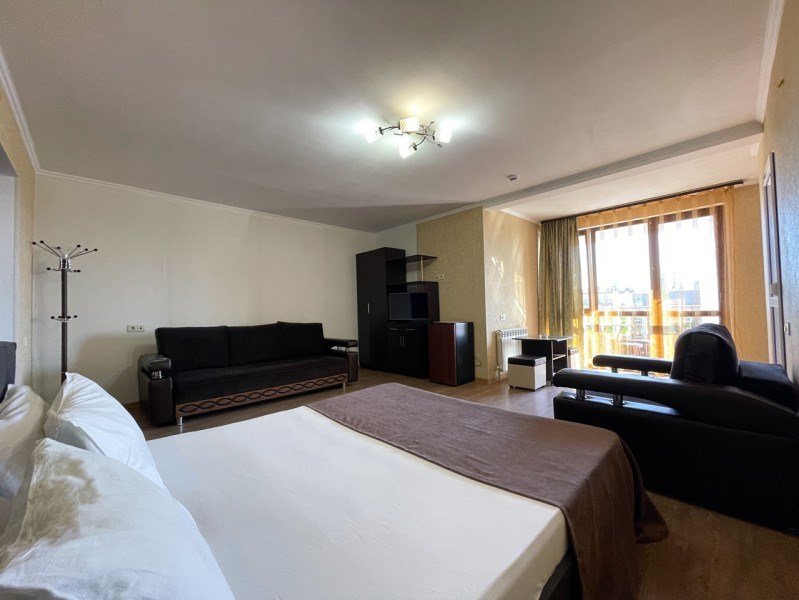 телевизор, Wi-Fi, кондиционер, фен, санузел, банные полотенца, гигиенические средства, балкон, двуспальная кровать, шкаф для одежды, журнальный столик, зеркало, раковина, отопление, душ, вид на город, стаканы, мини-холодильник, номер для некурящих, пуфик, кресло-кровать, двуспальный раскладной диван-кровать, уборка номера, мылоВ гостиничном номере